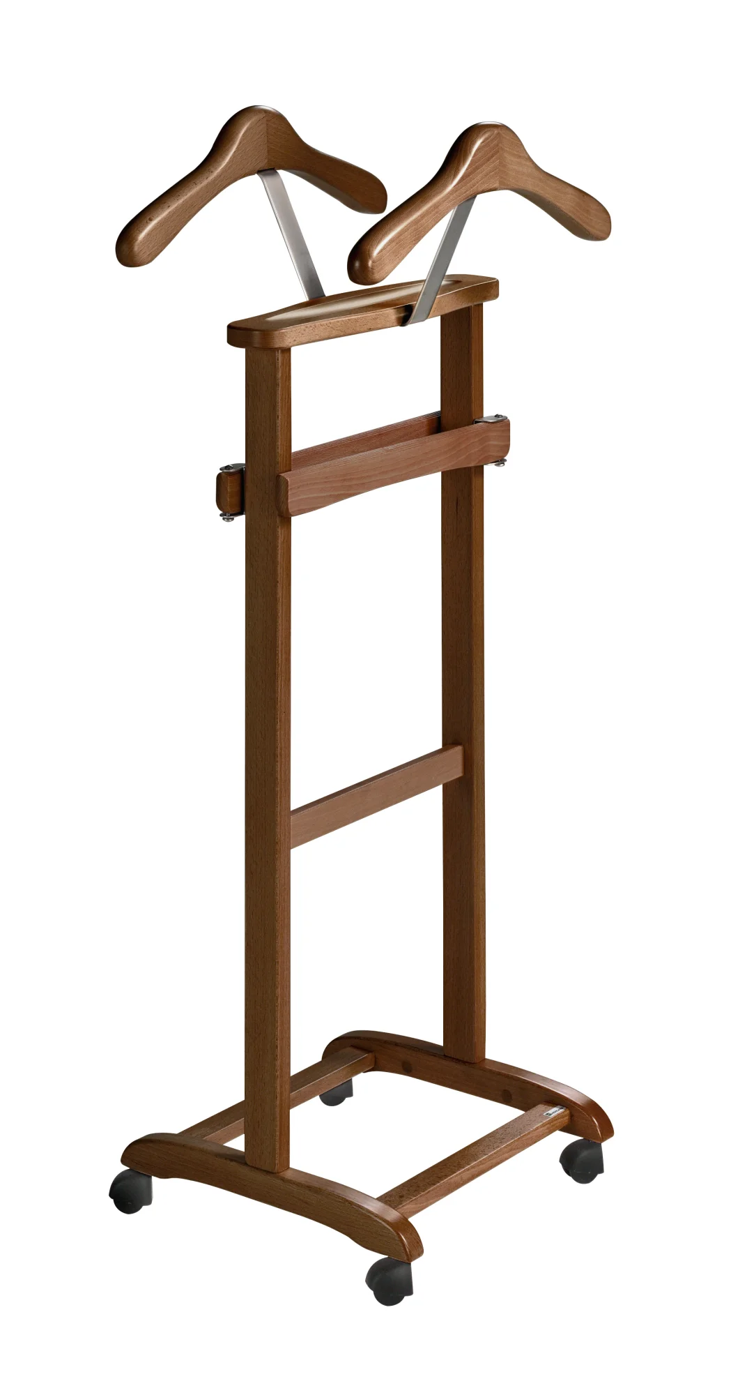Galán de noche doble, fabricado en madera de haya con detalles en metal cromado. Este accesorio aporta gran funcionalidad gravias a su doble percha y sus dos pantaloneras abatibles. Además, también lleva incorporada una bandeja alargada perfecta para dejar pequeños objetos. Las ruedas permiten su fácil desplazamiento. Elige entre una amplia variedad de colores para adaptarlo a tus gustos.