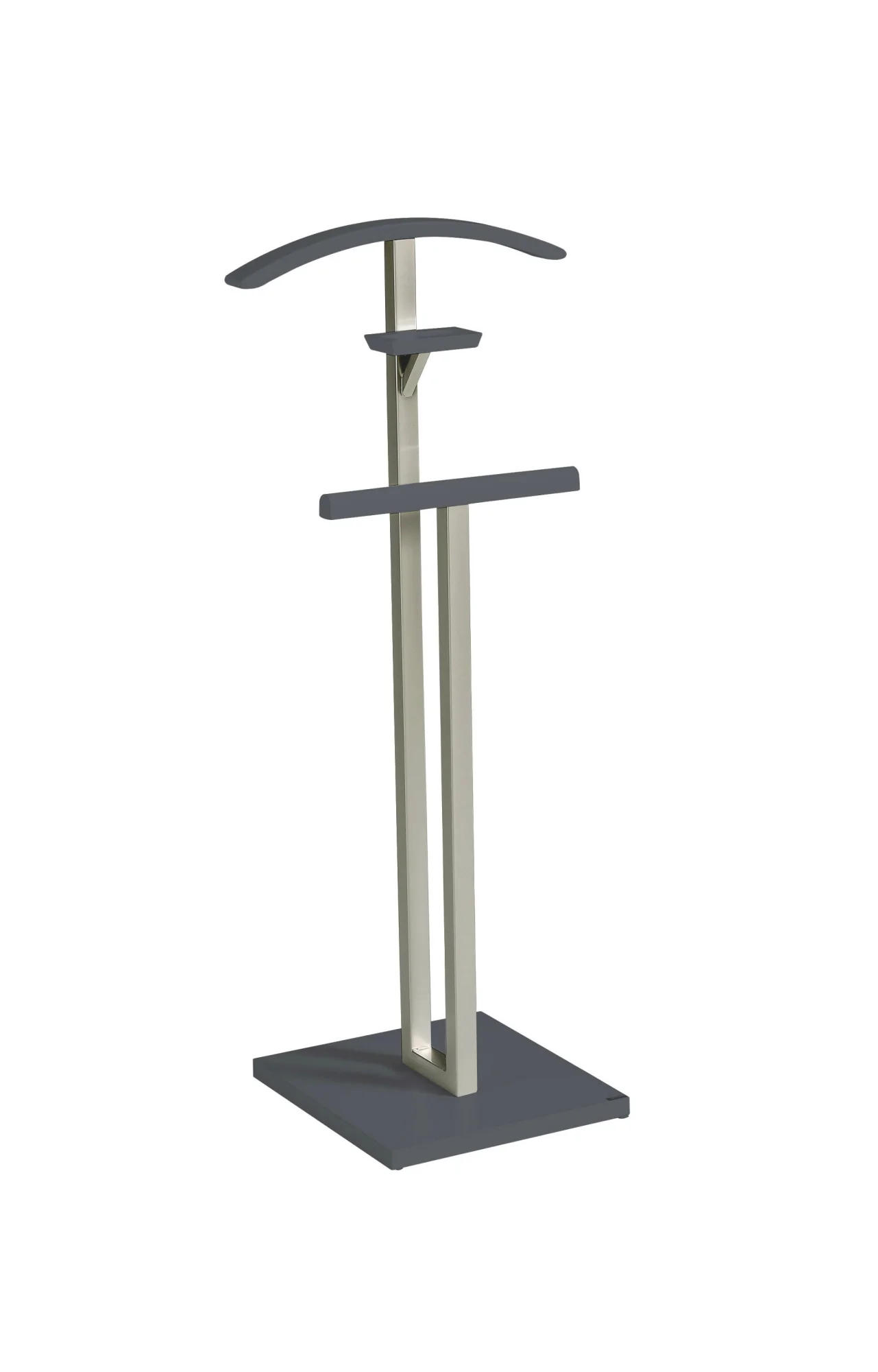 Galán de noche con doble mástil en metal cromado y detalles en madera de haya. Diseño sencillo y moderno compuesto por la percha, la pantalonera y una bandejita para dejar pequeños objetos. Disponible en una gran variedad de acabados, dándote la oportunidad de adaptarlo al estilo de tu dormitorio.