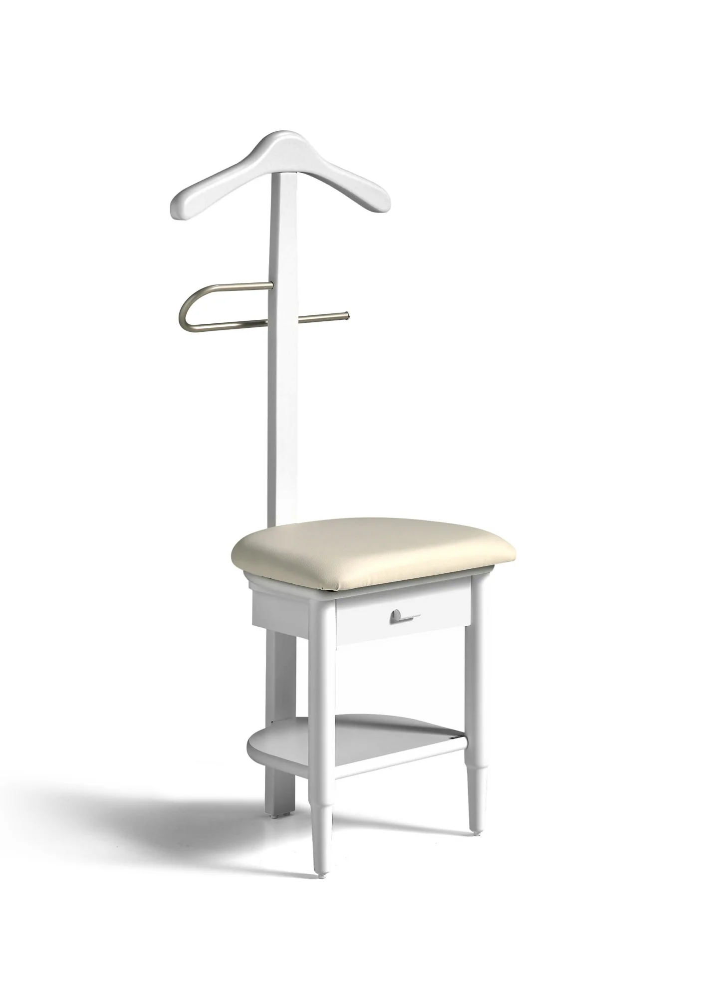 Silla galán fabricada en madera de haya con asiento tapizado y pantalonera metálica. Dispone de un cajón y un estante debajo del asiento, proporcionando un plus de funcionalidad. Este accesorio te ayudará a calzarte y descalzarte con facilidad, a la par que te permitirá mantener en orden tus prendas del día a día. Lo podrás adaptar a tus gustos lacándolo en múltiples opciones de color y escogiendo entre varios tapizados diferentes.