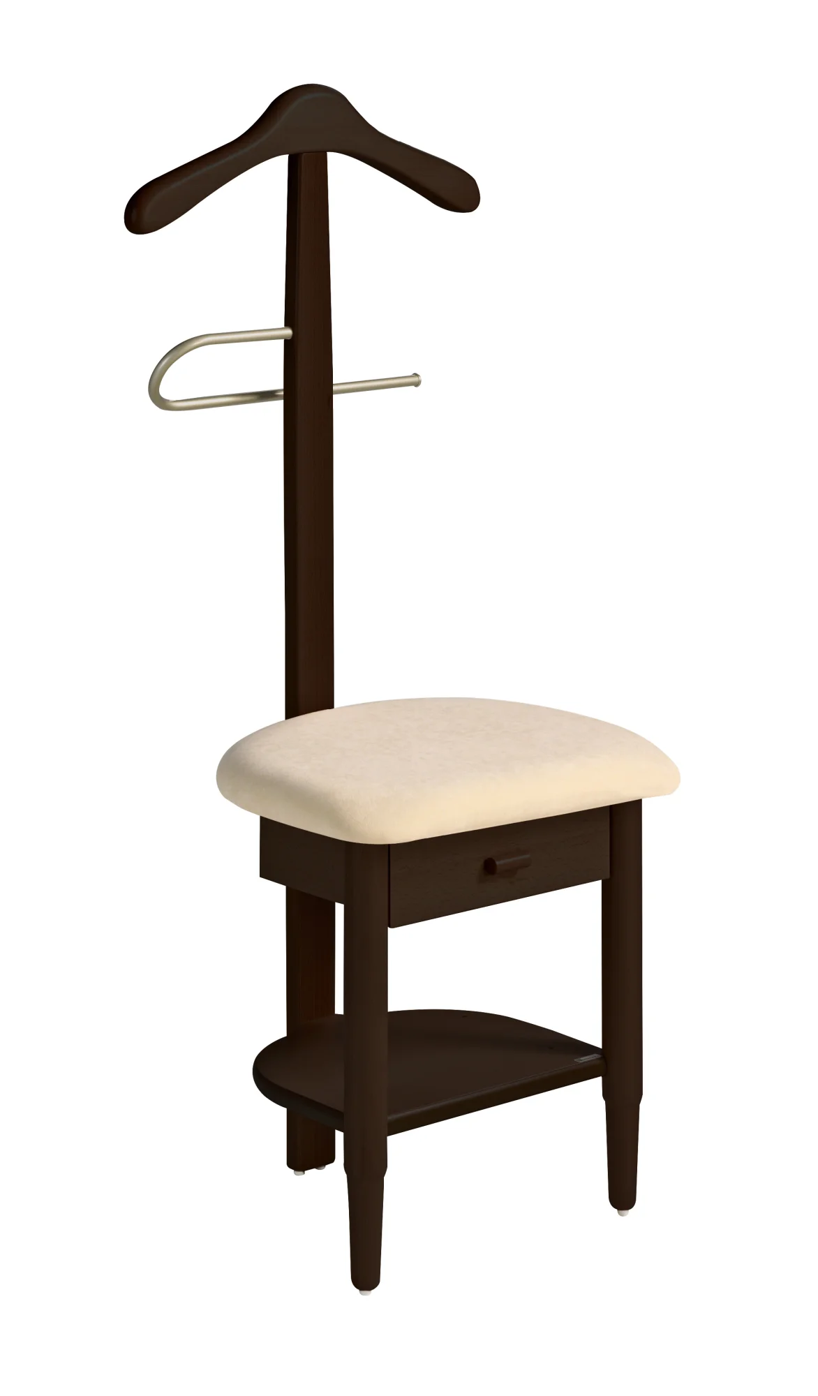 Silla galán fabricada en madera de haya con asiento tapizado y pantalonera metálica. Dispone de un cajón y un estante debajo del asiento, proporcionando un plus de funcionalidad. Este accesorio te ayudará a calzarte y descalzarte con facilidad, a la par que te permitirá mantener en orden tus prendas del día a día. Lo podrás adaptar a tus gustos lacándolo en múltiples opciones de color y escogiendo entre varios tapizados diferentes.