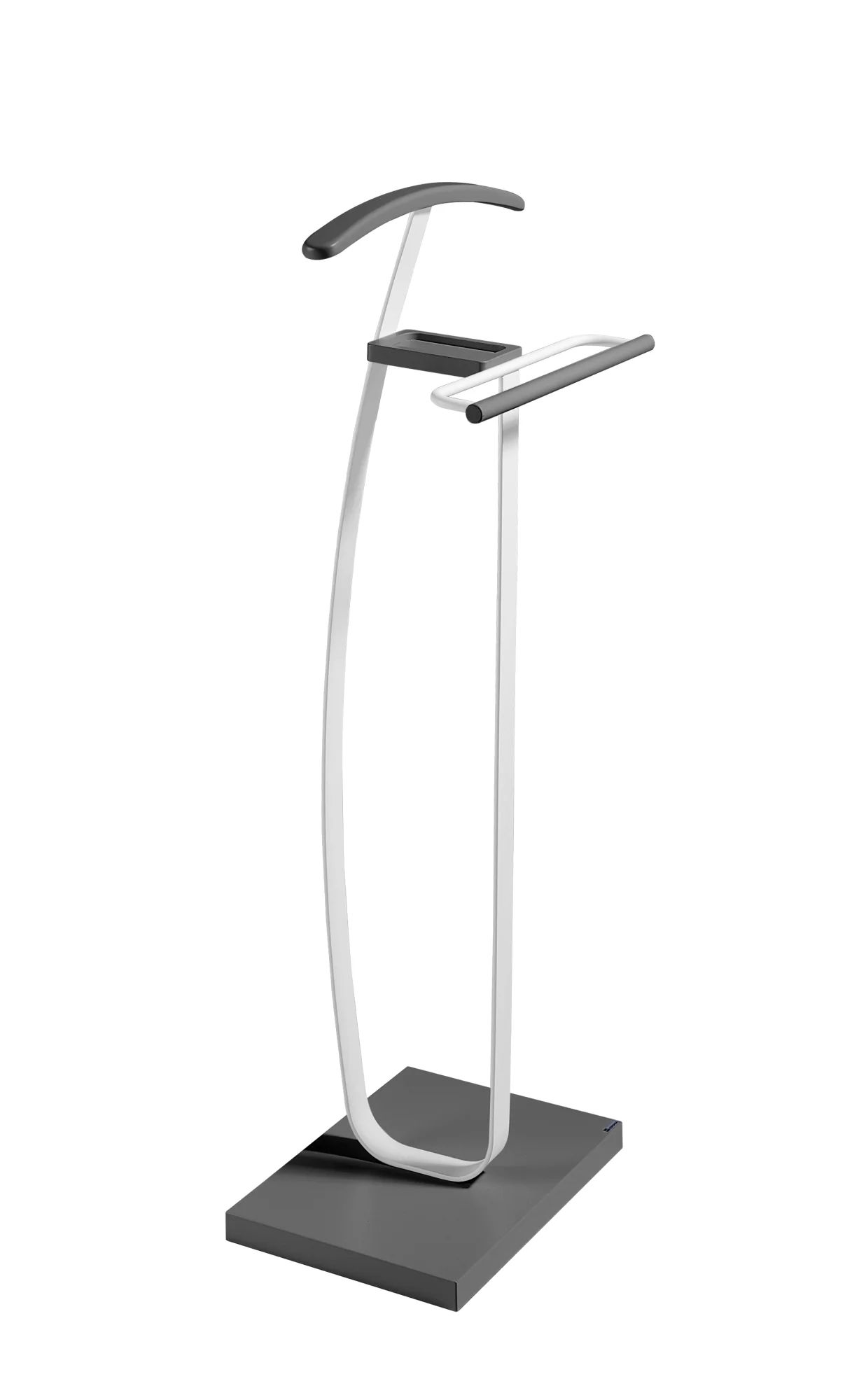 Galán de noche fabricado en metal y madera de haya. Diseño moderno y actual que dispone de la percha, la pantalonera y una bandeja central para los objetos más pequeños. Podrás elegir uno de nuestros múltiples colores para la madera, y combinarlo con el herraje blanco o grafito.