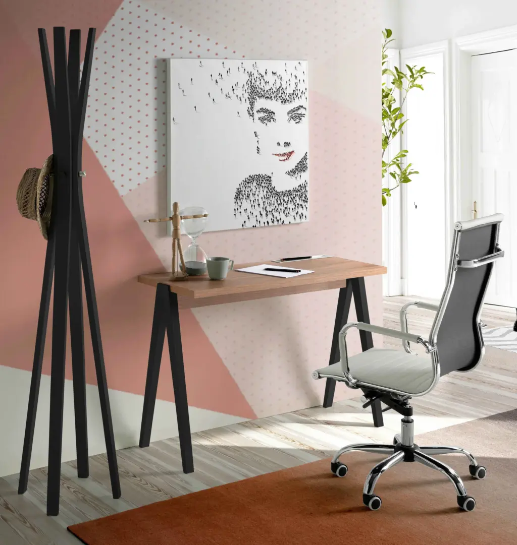 Perchero de pie fabricado en madera de haya con 4 colgadores metálicos. Original y atractivo diseño que podrás personalizar eligiendo entre una amplia gama de colores. El accesorio perfecto como complemento de la entrada, la oficina o incluso el salón.