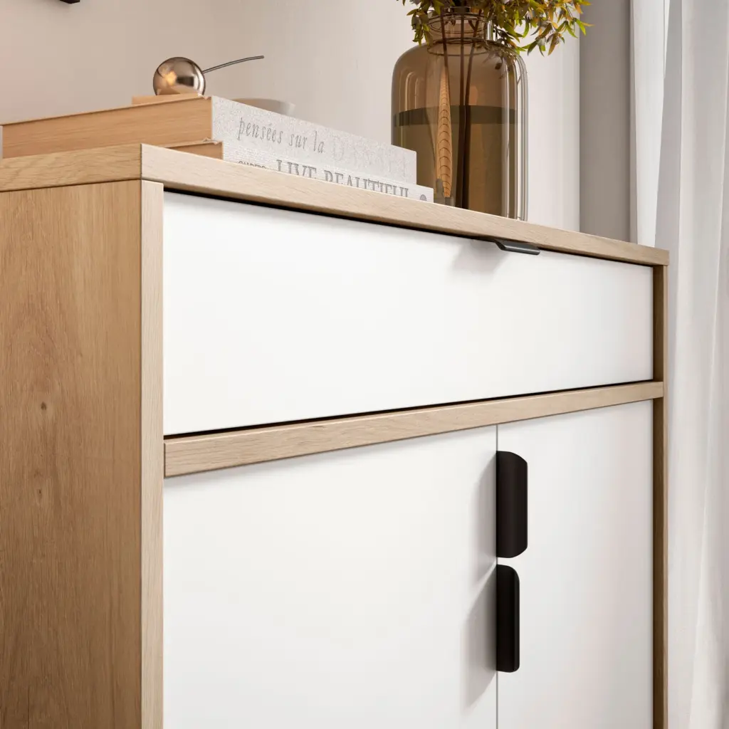 Zapatero en melamina con patas y tiradores metálicos en color negro. Dispone de un cajón en la parte superior y de 2 estantes interiores que pueden colocarse de manera horizontal o inclinada. Disponible en 4 acabados, podrás elegir el que mejor se adapte a tu hogar.