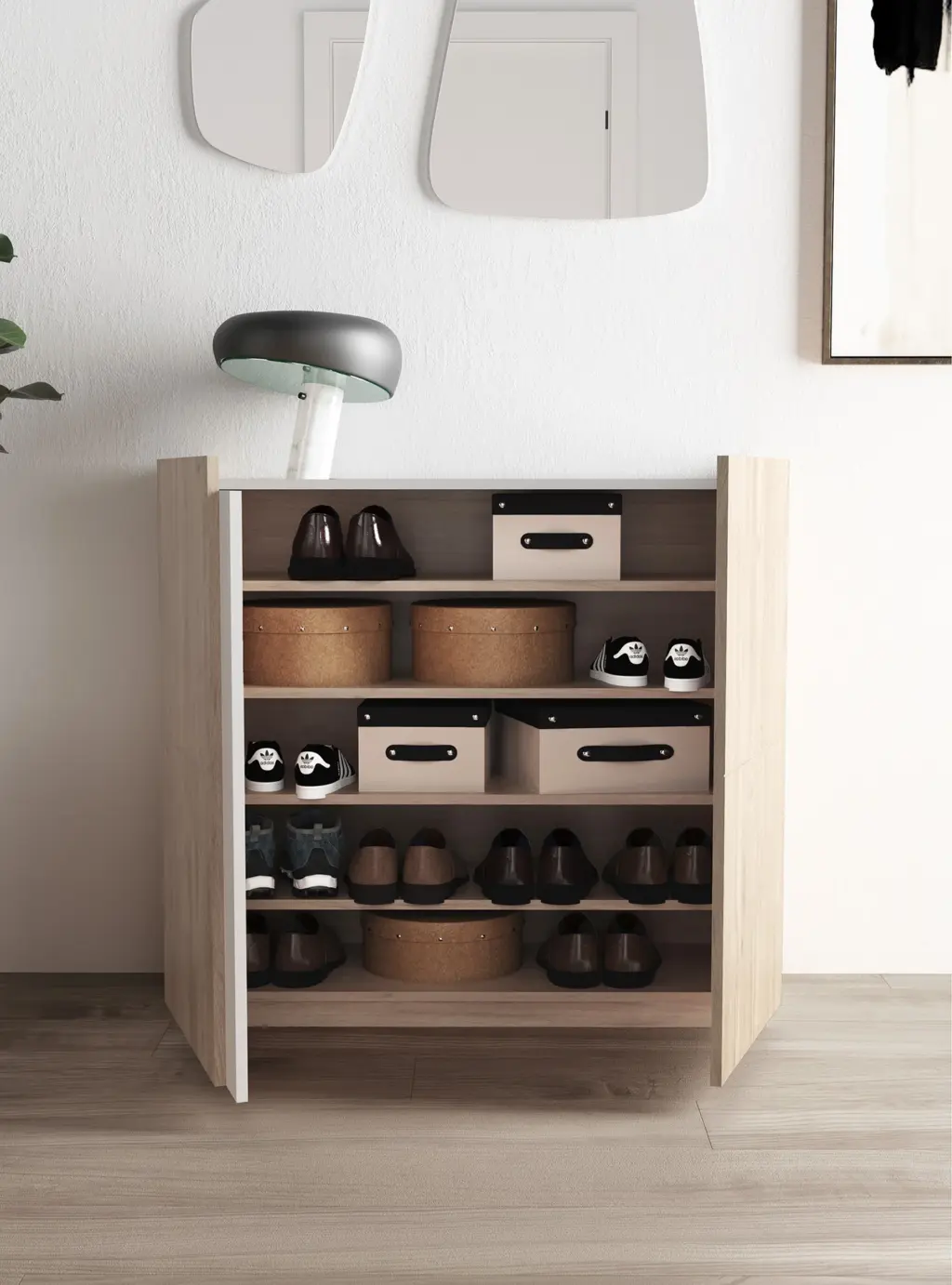 Zapatero fabricado en melamina. El interior se compone de 4 amplios estantes. Gracias a su gran variedad de acabados y su multifuncionalidad, se adaptará en infinidad de espacios proporcionando gran capacidad de almacenamiento en el dormitorio, la entrada o en cualquier otra estancia del hogar.