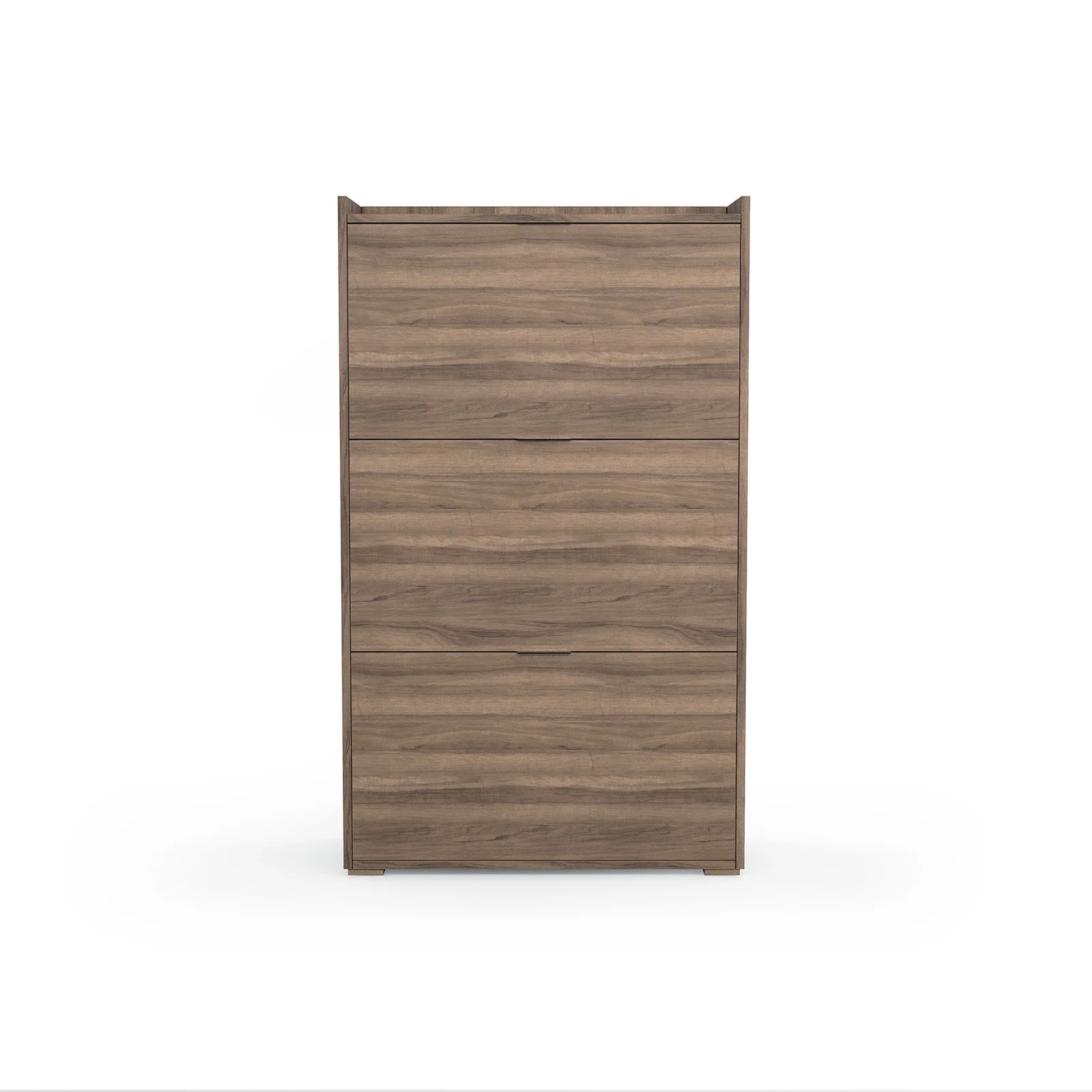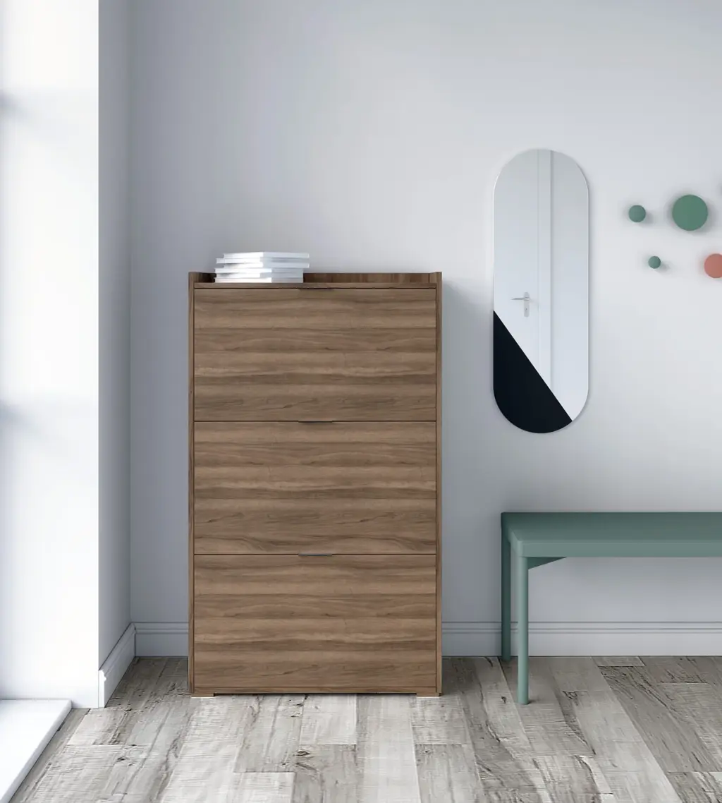 Zapatero abatible fabricado en melamina. Cada puerta esconde 2 amplios compartimentos proporcionando gran capacidad de almacenamiento, llegando a poder almacenar hasta 18 pares de calzado. La sencillez de su dieño lo hacen un mueble adaptable a diversos estilos y entornos.
