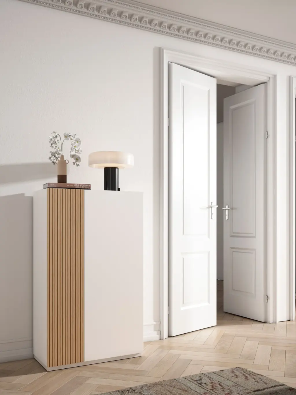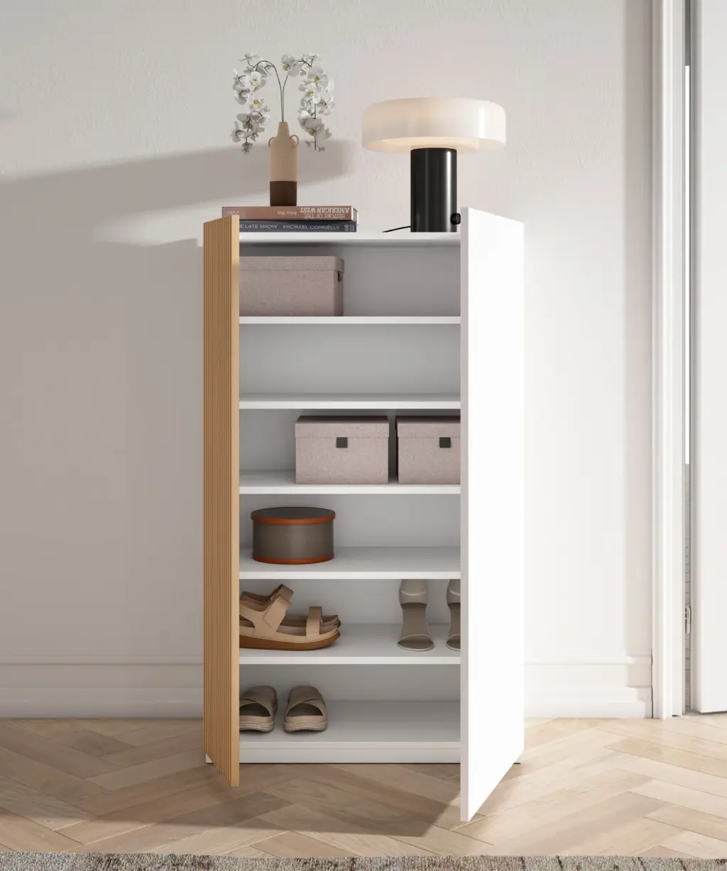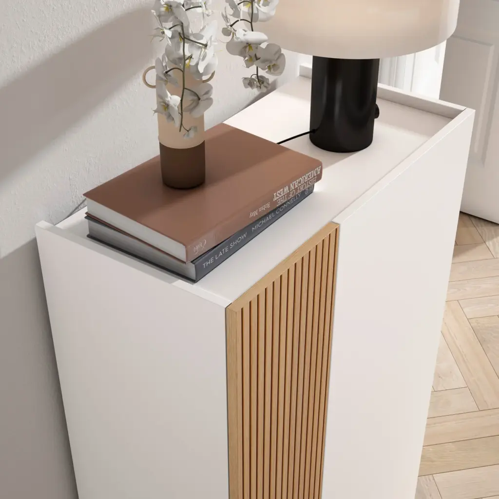 Aparador alto fabricado en melamina con 4 estantes interiores. Frente asimétrico con la puerta estrecha que puede combinarse en distintos acabados, resultando en un atractivo y moderno diseño. Lo podrás utilizar como recibidor, mueble auxiliar en el salón, o como almacenamiento en el dormitorio.