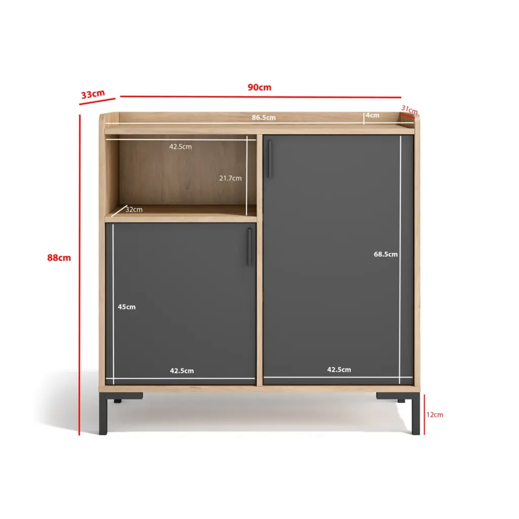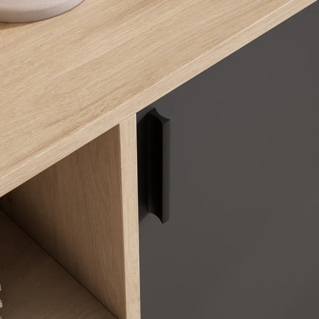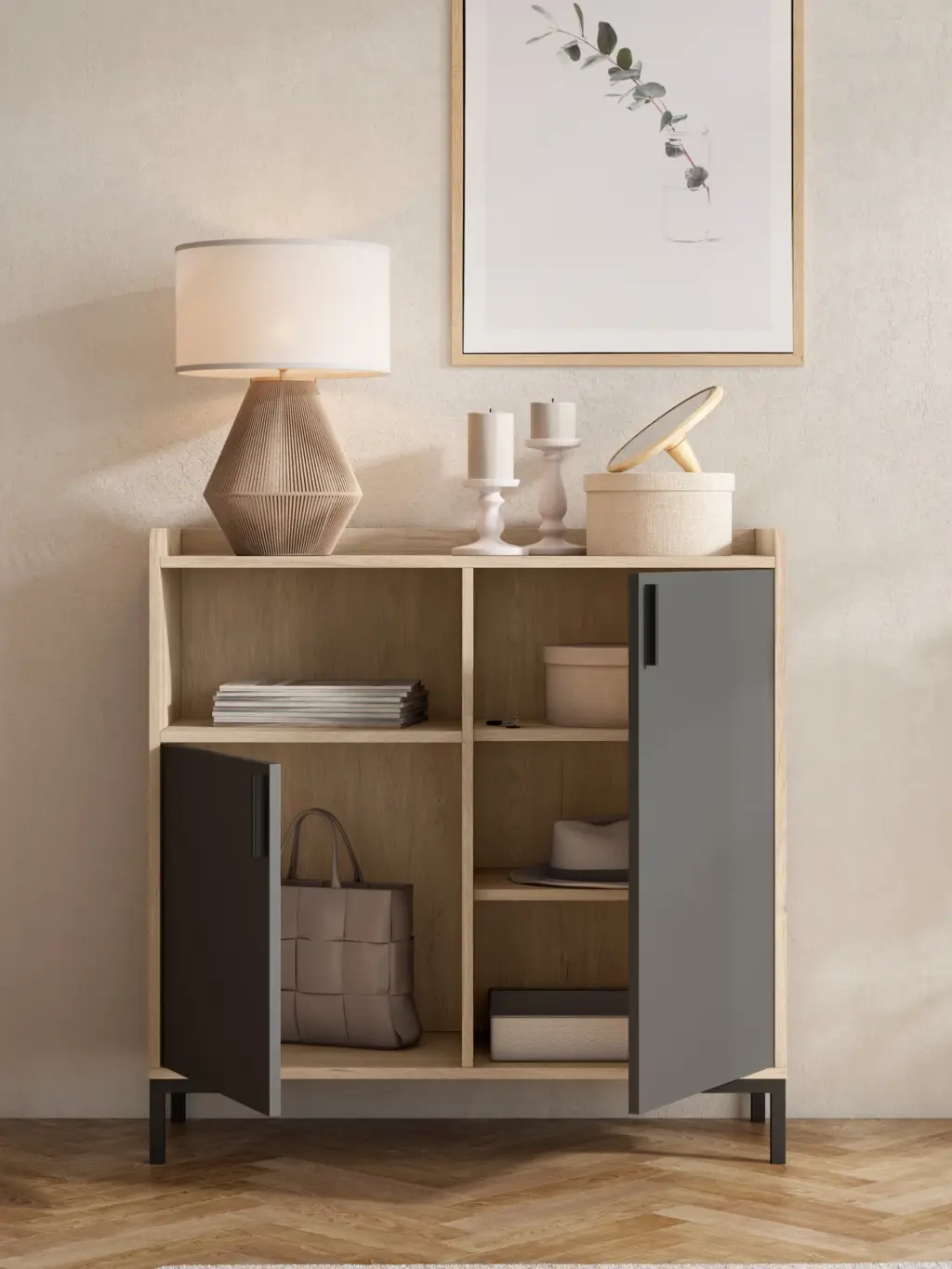 Mueble auxiliar multifuncional fabricado en melamina con patas y tiradores metálicos en color negro. Original diseño que mezcla las líneas rectas con un ligero canto curvado en el zócalo superior. Además, las puertas retranqueadas le dan un toque especial proporcionando profundidad.