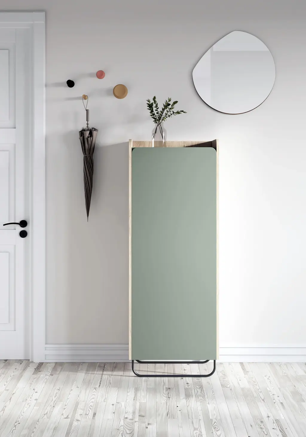 Zapatero fabricado en melamina con patas metálicas lacadas. El interior se compone de 5 estantes que se pueden posicionar de forma horizontal o inclinada, dependiendo de cada necesidad de almacenamiento. Las líneas curvas dan personalidad a este mueble auxiliar, que, gracias a su gran variedad de acabados y su multifuncionalidad, se adaptará en infinidad de espacios.