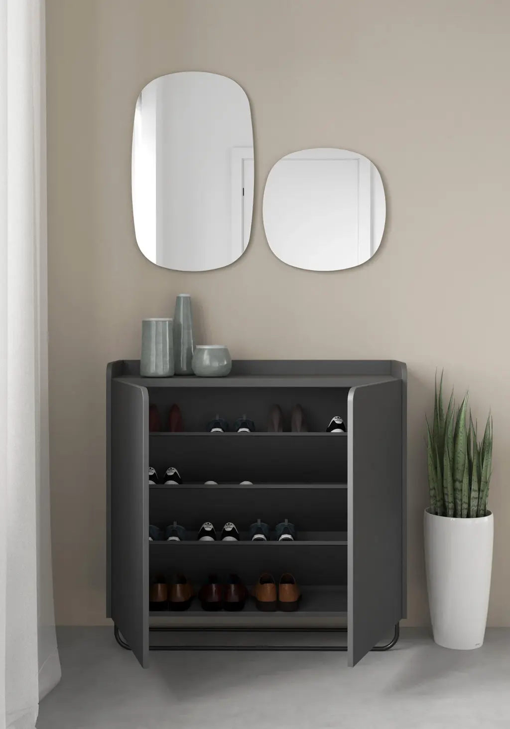 Zapatero fabricado en melamina con patas metálicas lacadas. El interior se compone de 5 estantes que se pueden posicionar de forma horizontal o inclinada, dependiendo de cada necesidad de almacenamiento. Las líneas curvas dan personalidad a este mueble auxiliar, que, gracias a su gran variedad de acabados y su multifuncionalidad, se adaptará en infinidad de espacios.