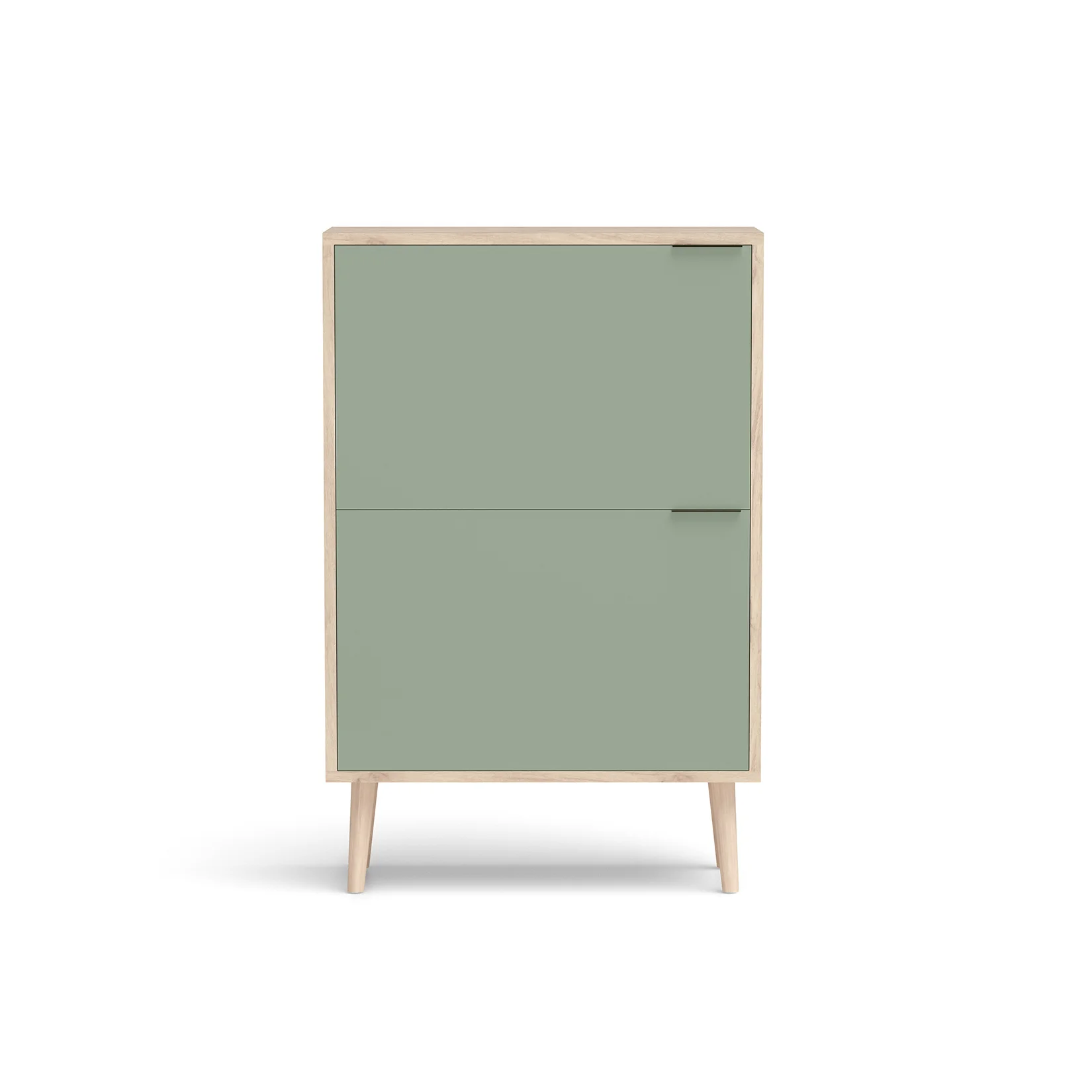 Zapatero abatible fabricado en melamina con patas en madera de haya. Sus 2 puertas esconden 4 trampones con capacidad para aproximadamente 10 pares de calzado. Sin ocupar demasiado espacio, esta opción te ayudará a mantener en orden el calzado del día a día.