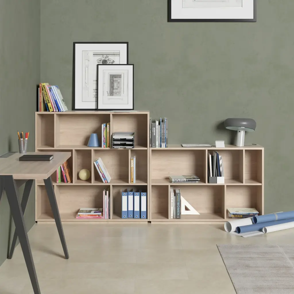 Estantería librería fabricada en melamina con gran capacidad de almacenamiento gracias a los múltiples huecos. El diseño es modular, por lo que se pueden colocar varias librerías juntas, ya sean del mismo modelo o de distinto, dentro de la colección de NACK.