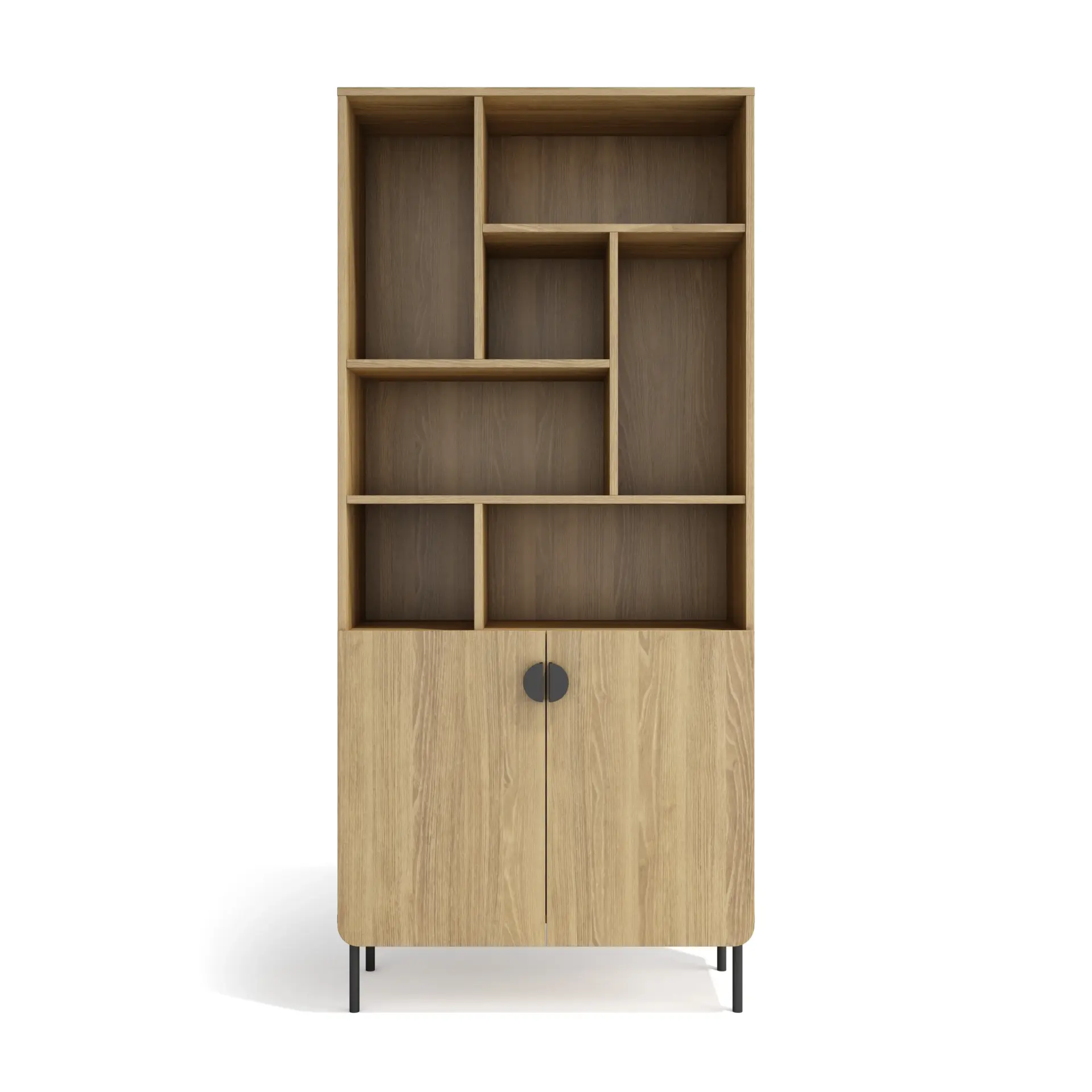 Organiza tu espacio con estilo gracias a esta estantería multifunción fabricada en melamina de alta calidad. Las patas metálicas negras le dan un toque industrial. Cuenta con estantes abiertos para colocar libros o elementos decorativos, además de un compartimento cerrado con 2 estantes interiores. Ideal para el salón, despacho o cualquier rincón de la casa.