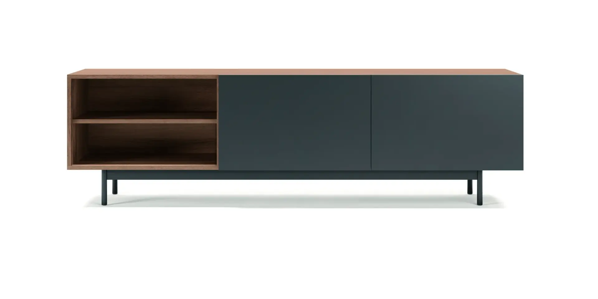Módulo de TV fabricado en melamina con patas metálicas. Múltiples composiciones y acabados te permitirán adaptarlo a tus necesidades sin perder el estilo. Combínalo con los aparadores de la misma colección para crear un ambiente acogedor y elegante.