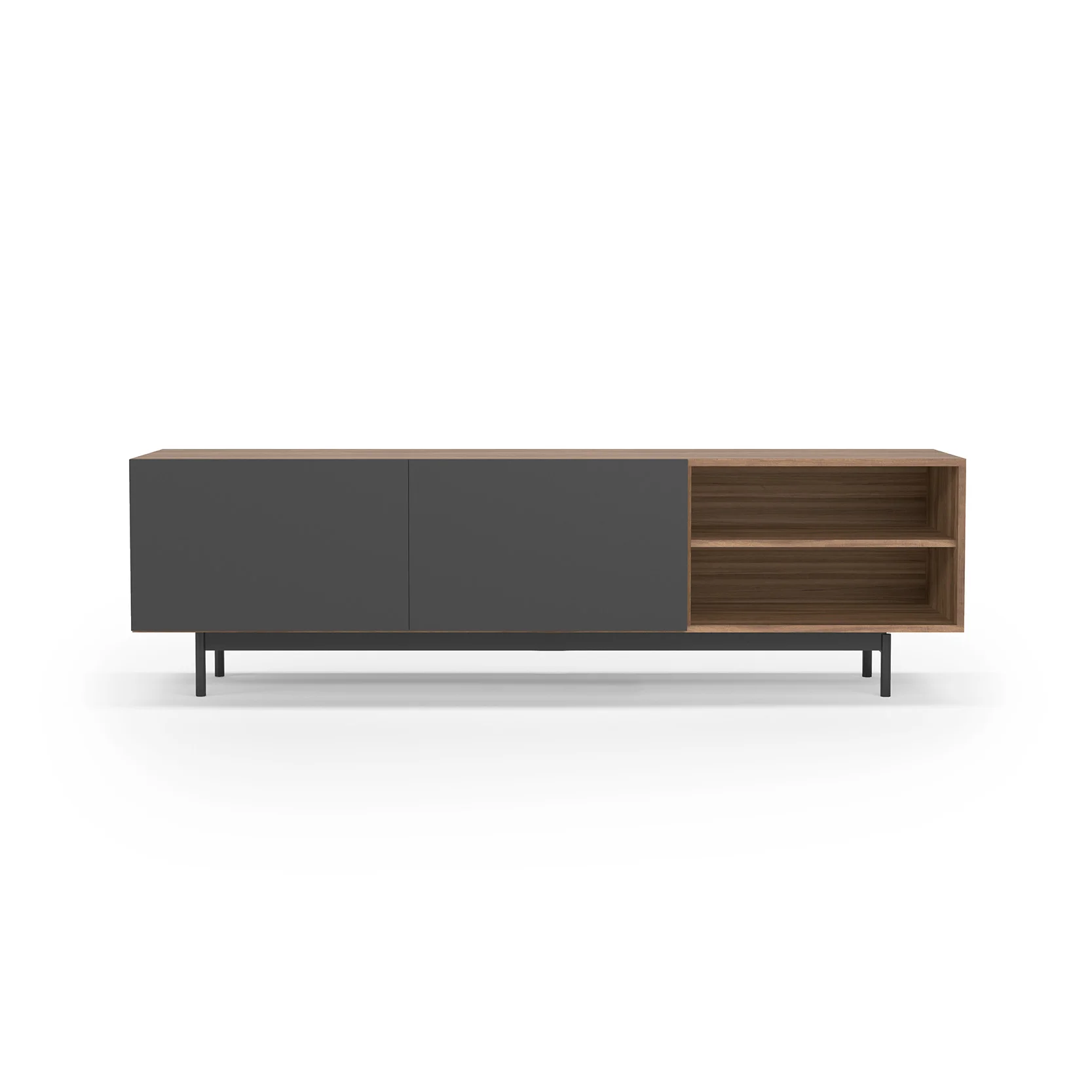 Módulo de TV fabricado en melamina con patas metálicas. Múltiples composiciones y acabados te permitirán adaptarlo a tus necesidades sin perder el estilo. Combínalo con los aparadores de la misma colección para crear un ambiente acogedor y elegante.