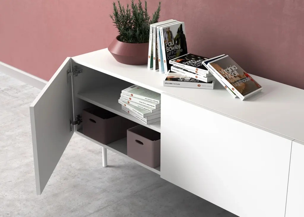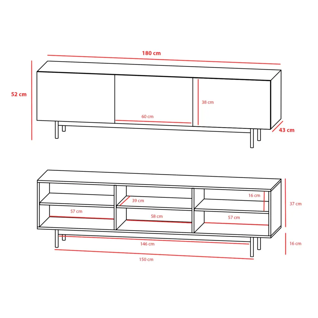 Módulo de TV fabricado en melamina con patas metálicas. Múltiples composiciones y acabados te permitirán adaptarlo a tus necesidades sin perder el estilo. Combínalo con los aparadores de la misma colección para crear un ambiente acogedor y elegante.