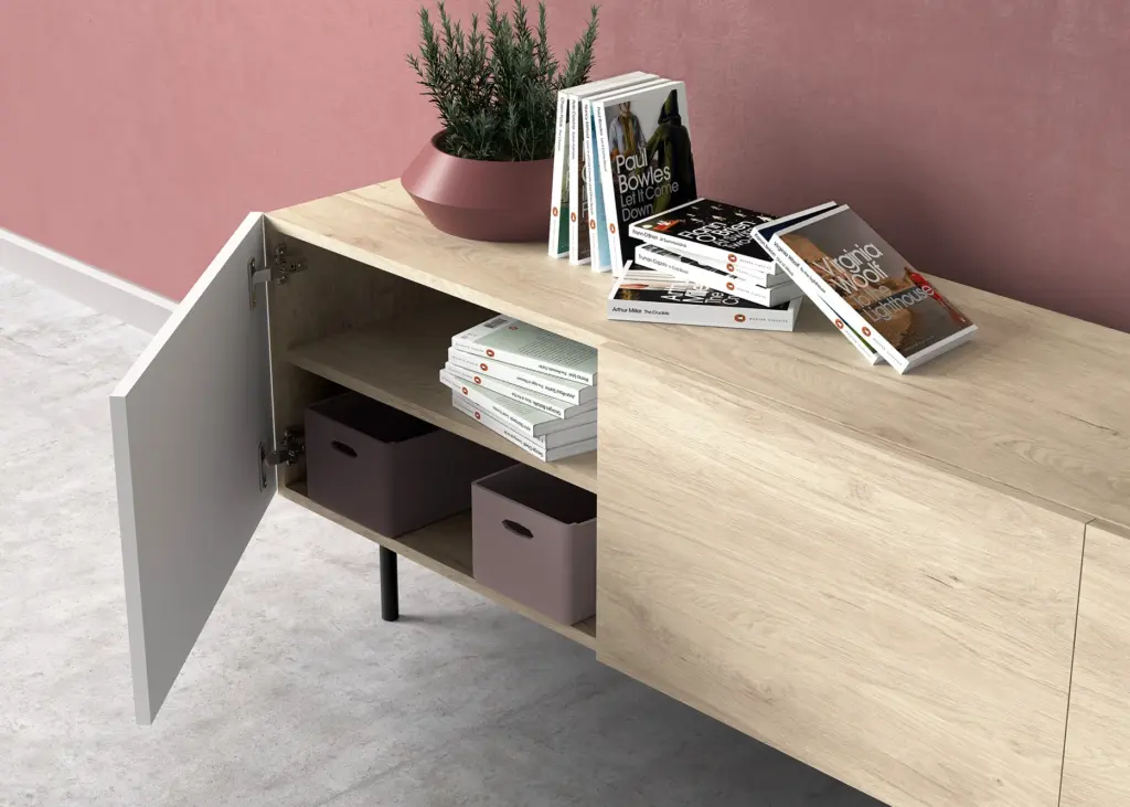 Módulo de TV fabricado en melamina con patas metálicas. Múltiples composiciones y acabados te permitirán adaptarlo a tus necesidades sin perder el estilo. Combínalo con los aparadores de la misma colección para crear un ambiente acogedor y elegante.