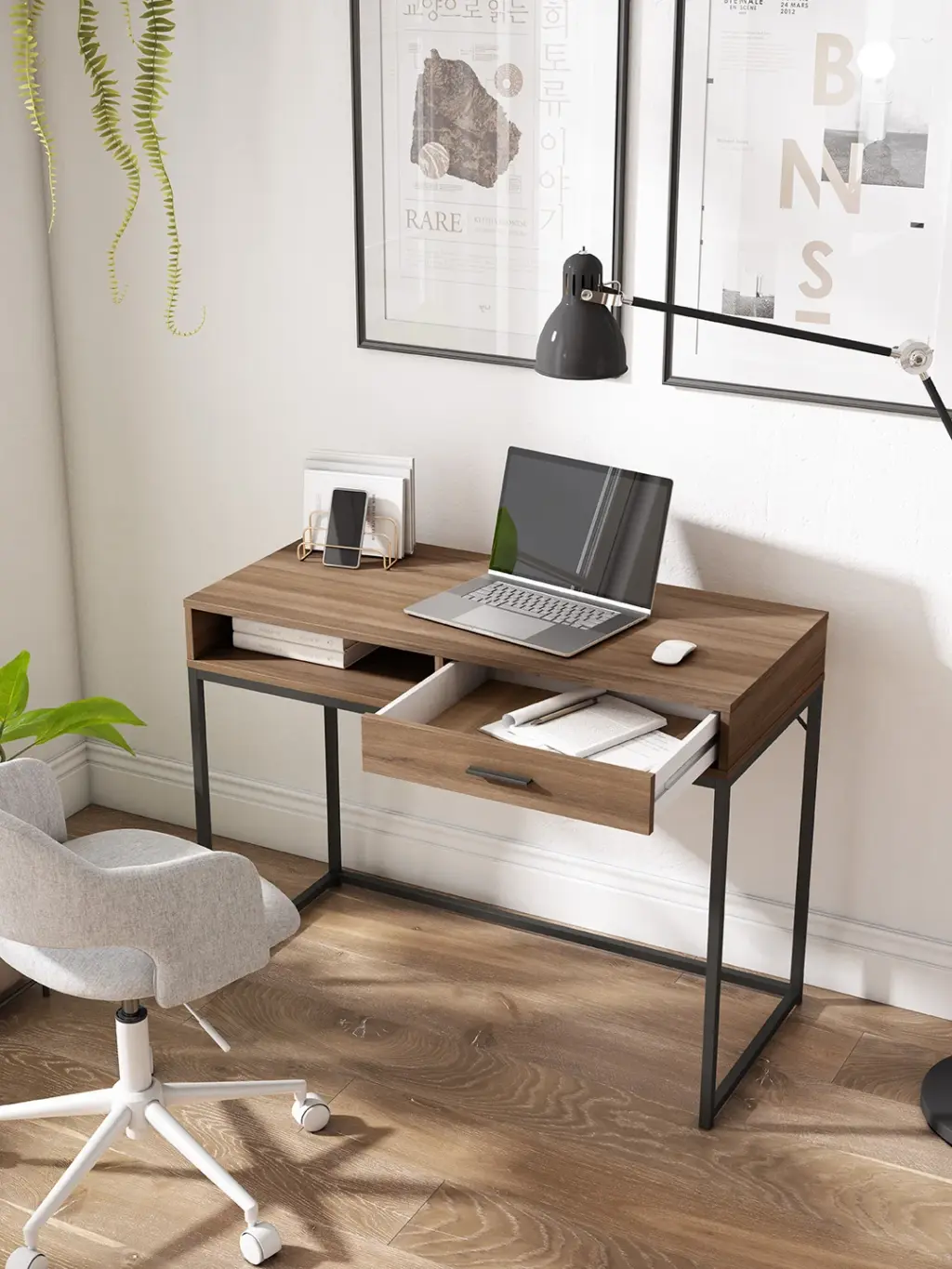 Escritorio fabricado en melamina con patas metálicas negras. Diseño contemporáneo y práctico que dispone de un cajón y de un compartimento bajo la tapa principal. Elige el acabado que mejor funcione con tu despacho o área de estudio.