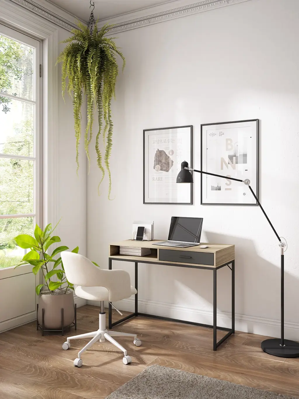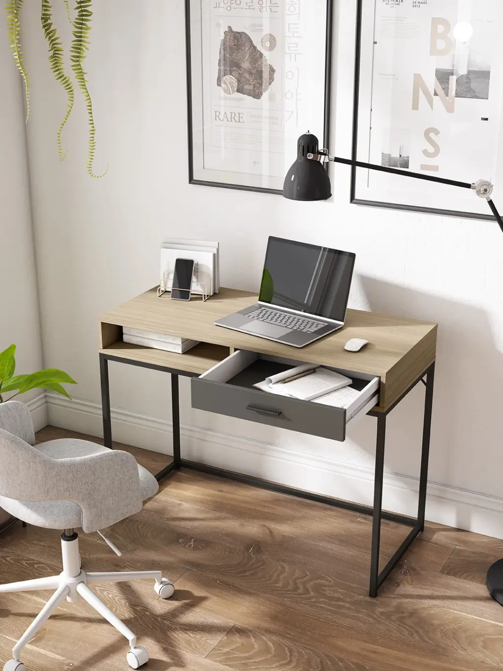 Escritorio fabricado en melamina con patas metálicas negras. Diseño contemporáneo y práctico que dispone de un cajón y de un compartimento bajo la tapa principal. Elige el acabado que mejor funcione con tu despacho o área de estudio.