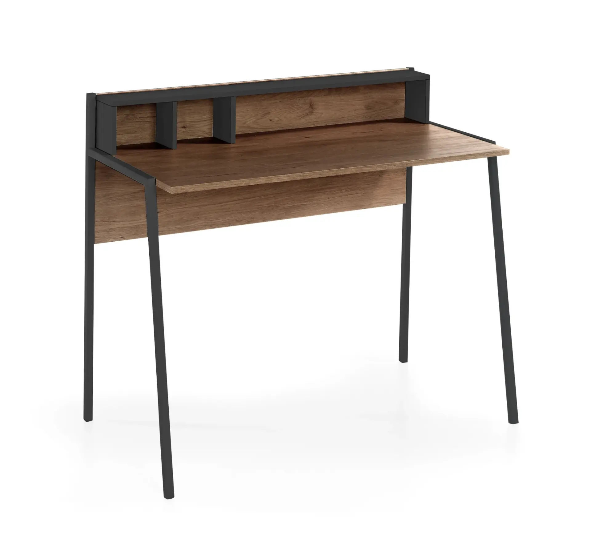 Mesa de estudio sencilla fabricada en melamina y metal. Su amplia tapa dispone de un pequeño zócalo a modo de estante cuyo diseño crea varios huecos organizadores debajo. Su estilo neutro permite colocarlo en múltiples espacios, ya sea en un dormitorio juvenil o en un despacho general.