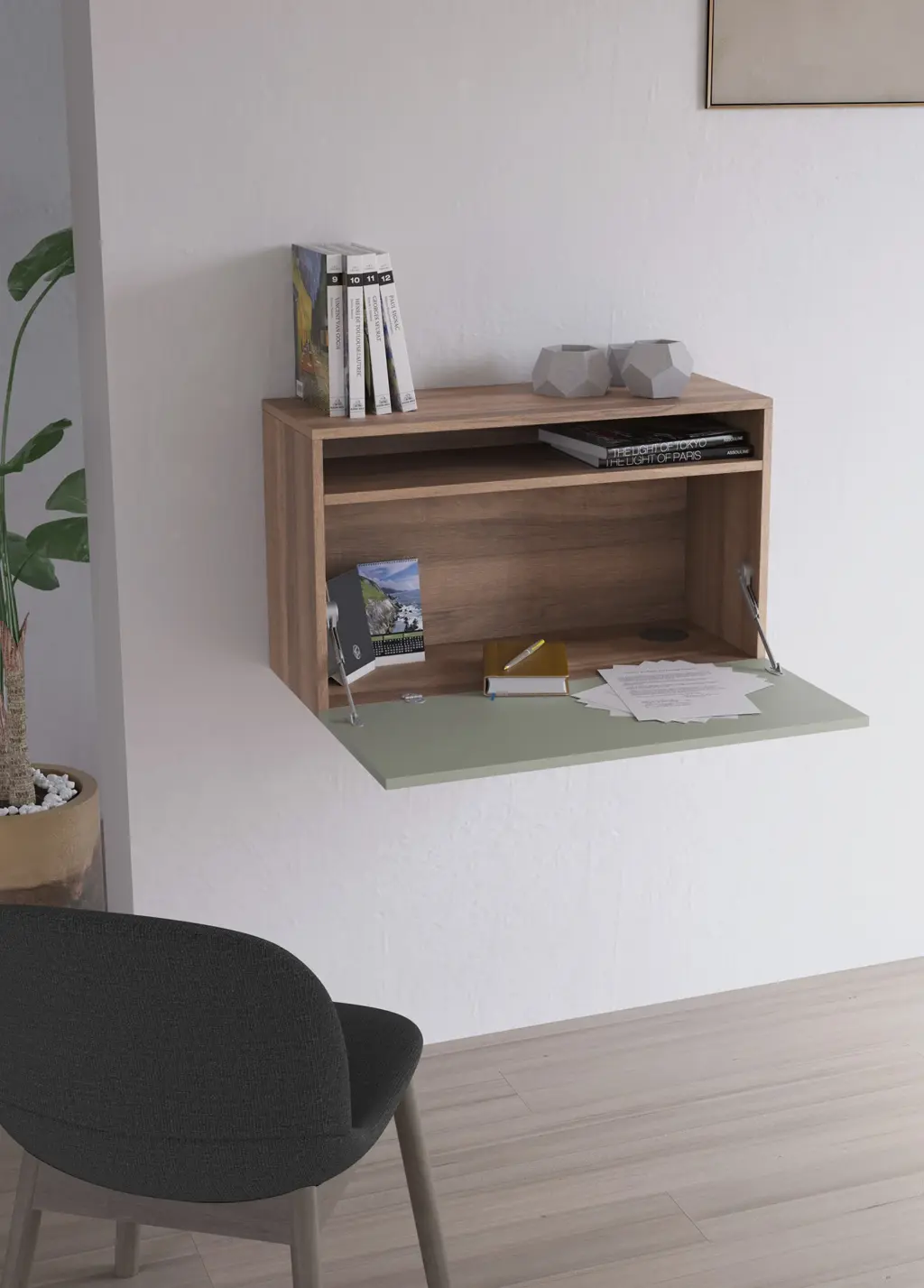 Escritorio suspendido fabricado en melamina. Dispone de un amplio área de trabajo con orificio pasa-cables incluido y un compartimento superior. El diseño con puerta abatible la da más funcionalidades, pudiéndose utilizar también como mueble auxiliar en la entrada o en el salón entre otros. Lo podrás adaptar al estilo de tu hogar gracias a la gran variedad de combinaciones disponibles.