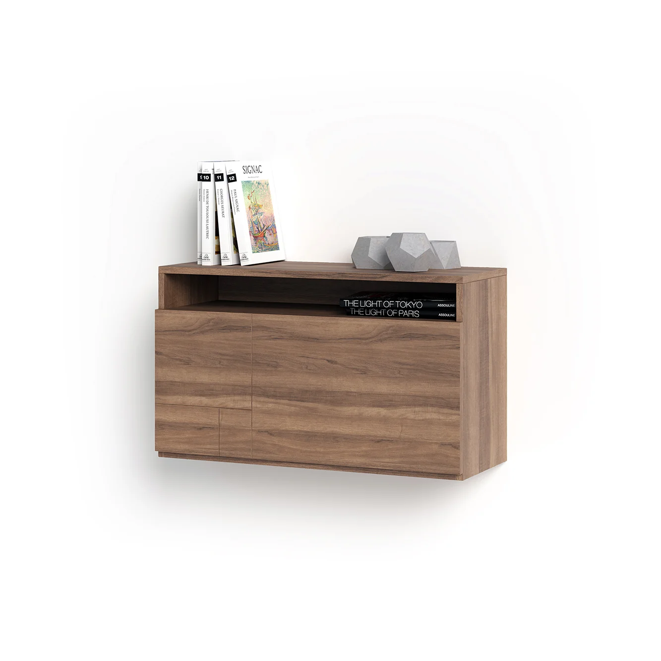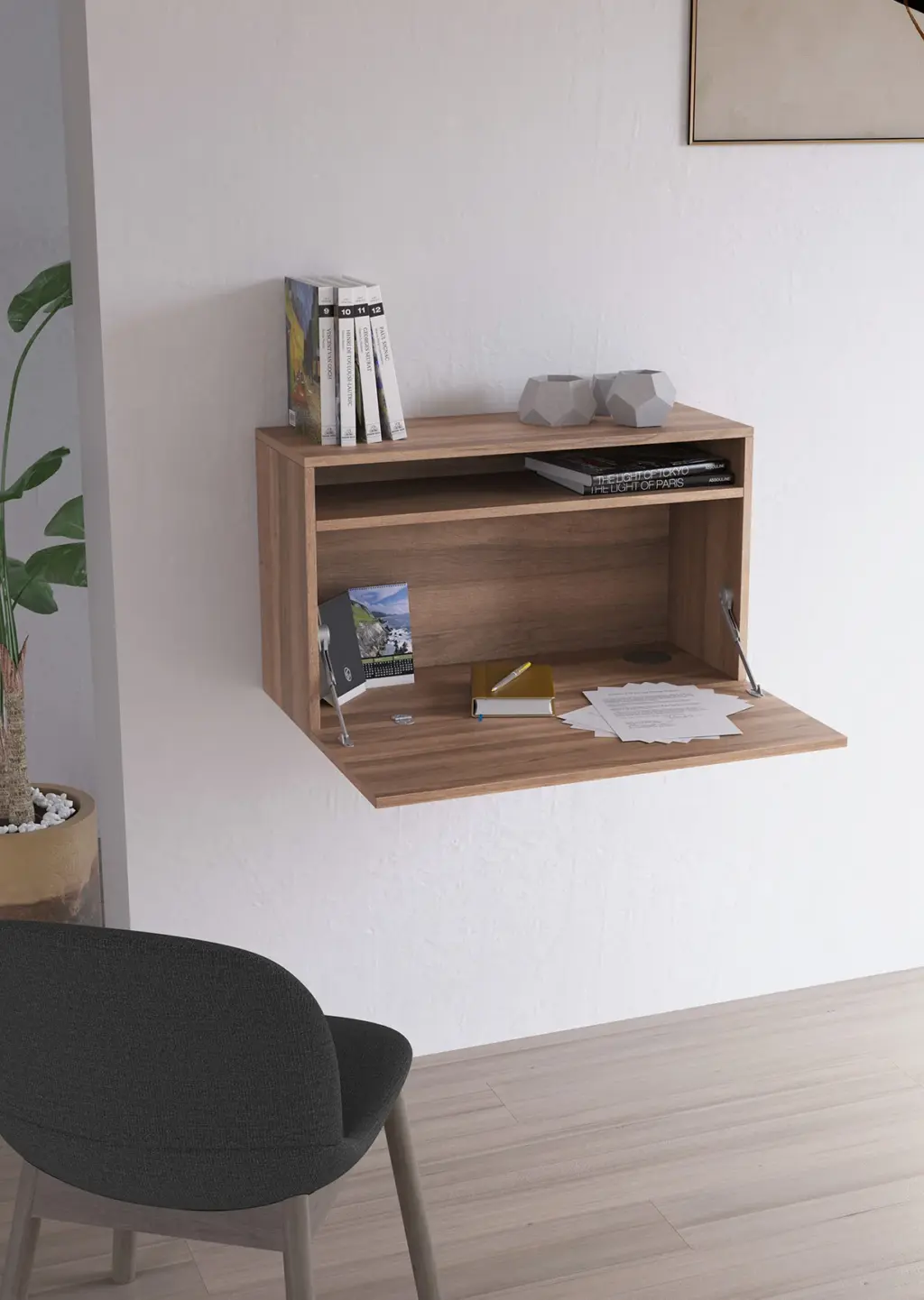 Escritorio suspendido fabricado en melamina. Dispone de un amplio área de trabajo con orificio pasa-cables incluido y un compartimento superior. El diseño con puerta abatible la da más funcionalidades, pudiéndose utilizar también como mueble auxiliar en la entrada o en el salón entre otros. Lo podrás adaptar al estilo de tu hogar gracias a la gran variedad de combinaciones disponibles.
