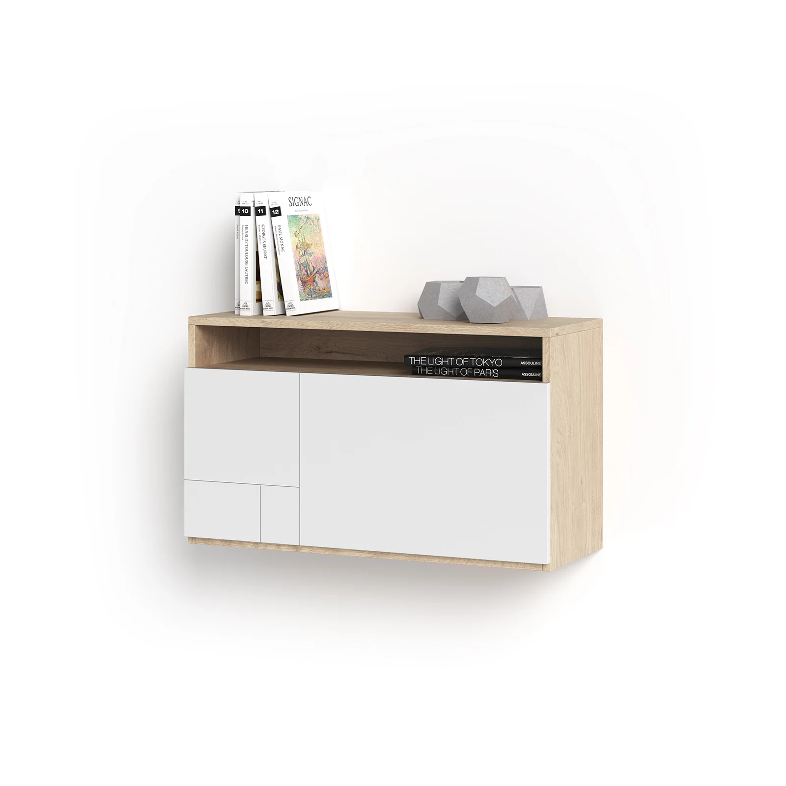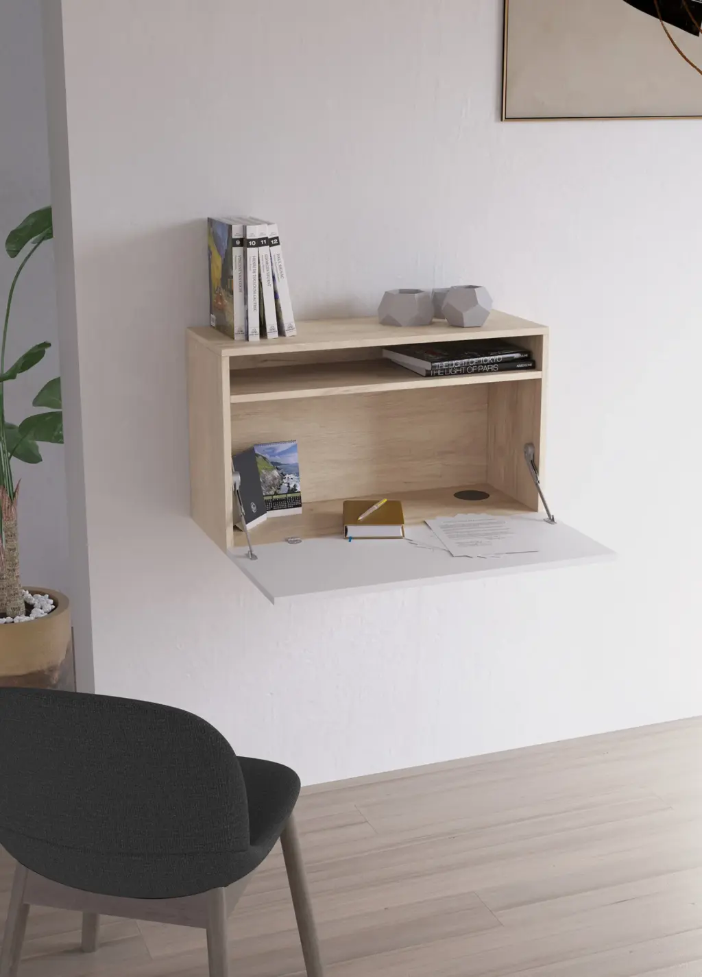 Escritorio suspendido fabricado en melamina. Dispone de un amplio área de trabajo con orificio pasa-cables incluido y un compartimento superior. El diseño con puerta abatible la da más funcionalidades, pudiéndose utilizar también como mueble auxiliar en la entrada o en el salón entre otros. Lo podrás adaptar al estilo de tu hogar gracias a la gran variedad de combinaciones disponibles.