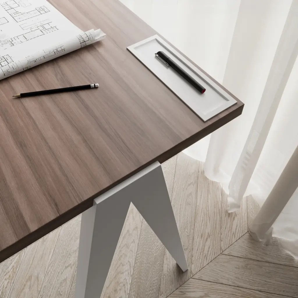 Mesa de estudio sencilla fabricada en melamina y madera de haya. Su amplia tapa dispone de un pequeño portalápices el cual se laca junto a las patas en cualquiera de nuestros colores. Atractivo diseño que, gracias a sus infinitas posibilidades, se adaptará a cualquier ambiente, ya sea en un dormitorio juvenil o en un despacho general.