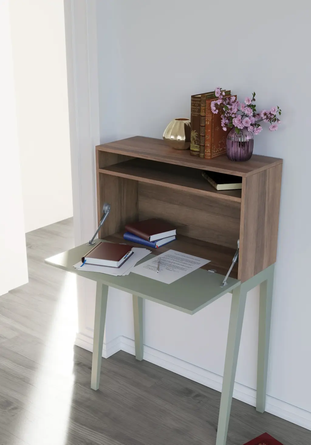 Escritorio fabricado en melamina con patas de madera de haya. Dispone de un amplio área de trabajo con orificio pasa-cables incluido y un compartimento superior. El diseño con puerta abatible la da más funcionalidades, pudiéndose utilizar también como mueble auxiliar en la entrada o en el salón entre otros. Lo podrás adaptar al estilo de tu hogar gracias a la gran variedad de combinaciones disponibles.