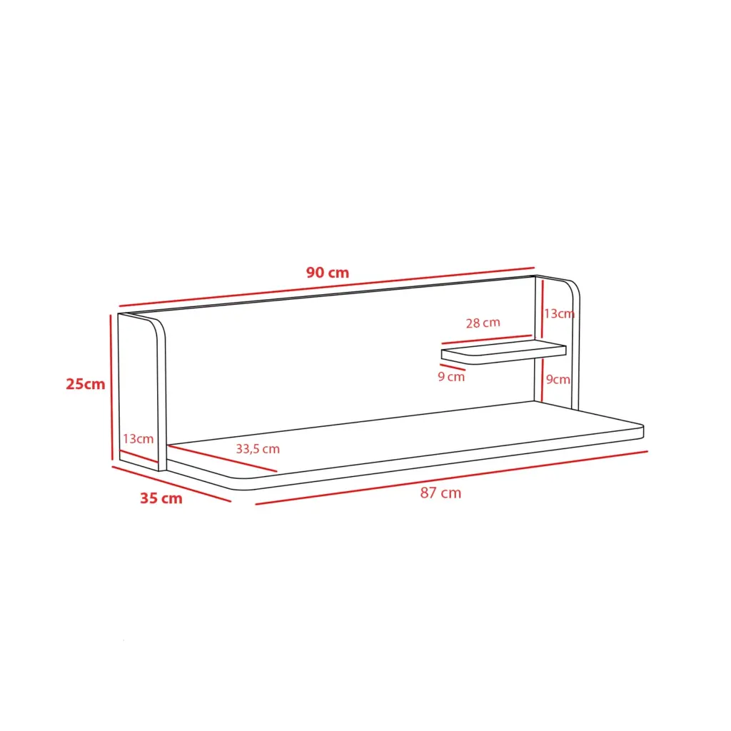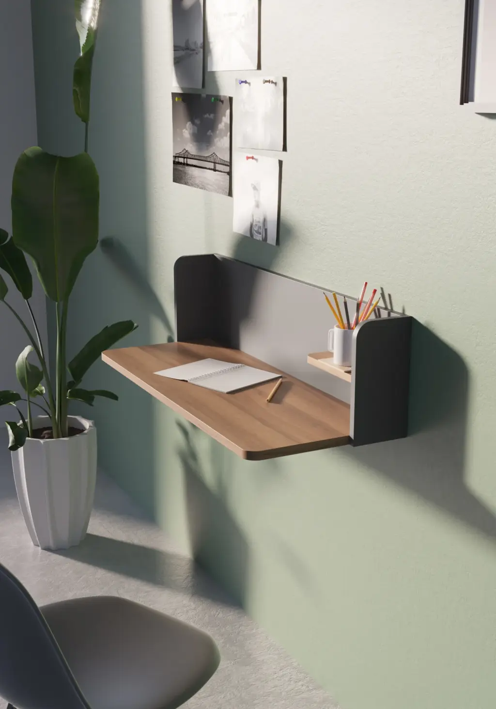 Escritorio suspendido fabricado en melamina. Sus dimensiones lo hacen el elemento ideal para espacios reducidos, sin dejar de aportar la funcionalidad necesaria. El diseño minimalista contribuye a crear un espacio único, ya sea en el despacho o en un rincón del salón.