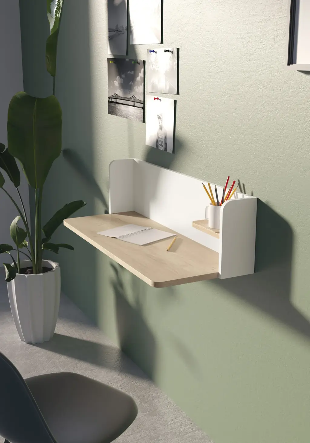 Escritorio suspendido fabricado en melamina. Sus dimensiones lo hacen el elemento ideal para espacios reducidos, sin dejar de aportar la funcionalidad necesaria. El diseño minimalista contribuye a crear un espacio único, ya sea en el despacho o en un rincón del salón.