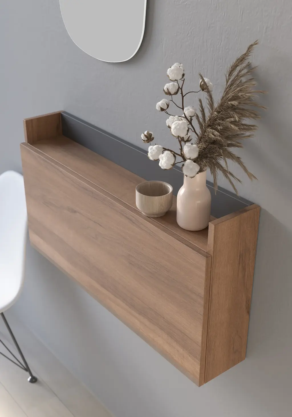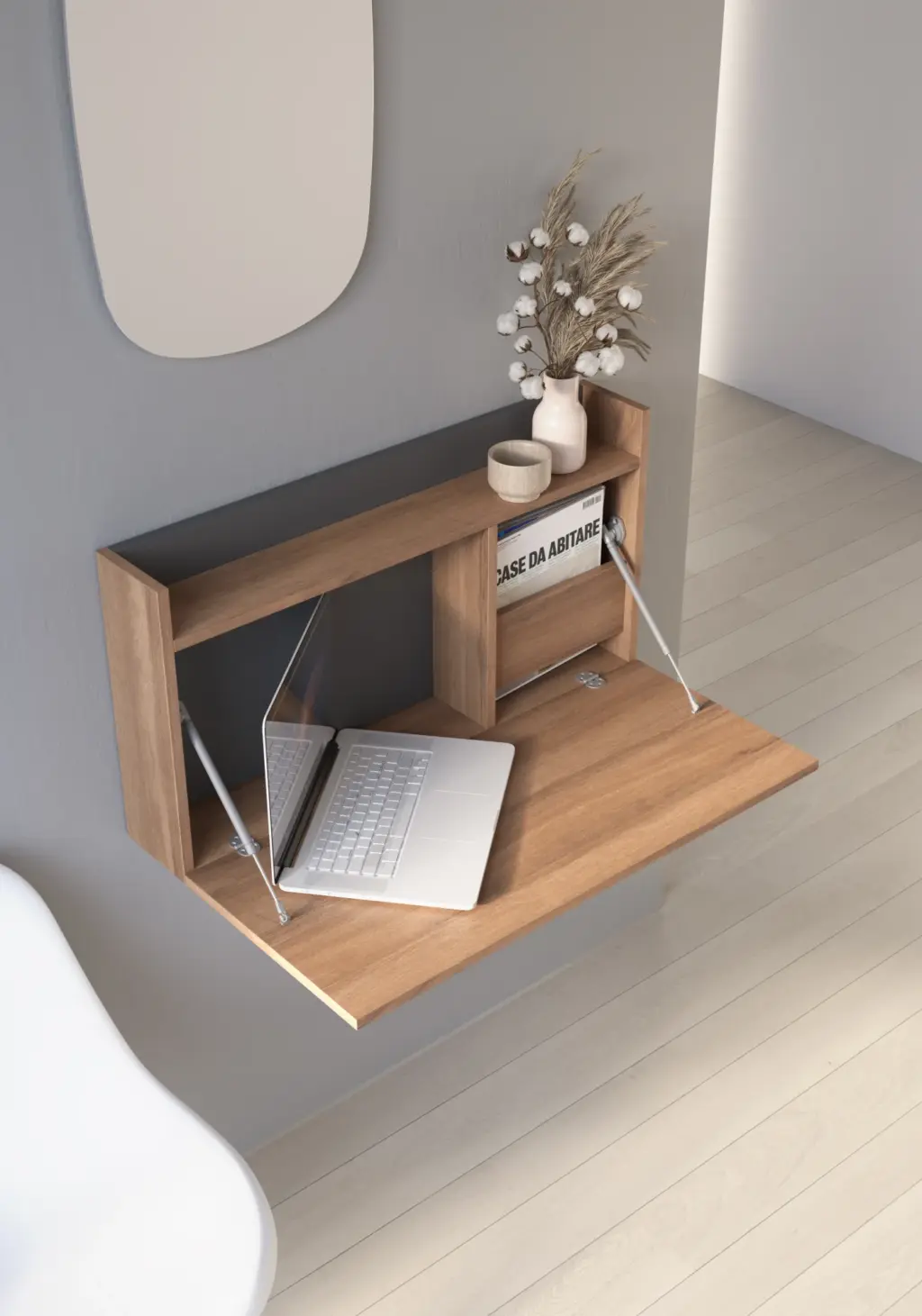 Escritorio suspendido fabricado en melamina. Dispone de varias zonas de almacenamiento y un estante superior. El diseño con puerta abatible la da más funcionalidades, pudiéndose utilizar también como mueble auxiliar en la entrada o en el salón entre otros.