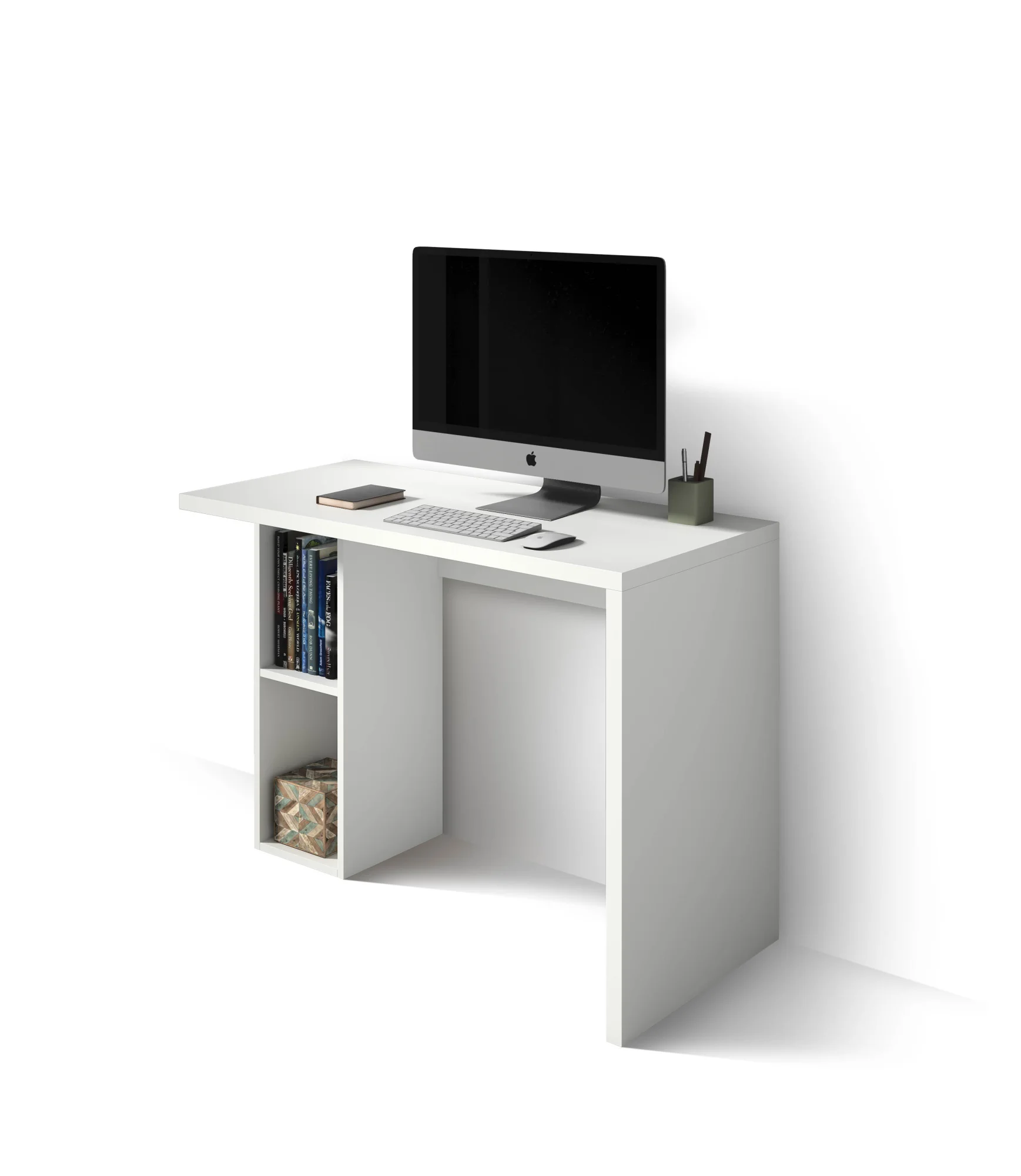 Mesa de estudio sobria fabricada en melamina. Además del amplio espacio de trabajo, esta pieza cuenta con una pequeña estantería bajo la tapa principal. El planteamiento sencillo de este mueble lo convierten en un elemento muy versátil, pudiendose adaptar a diferentes estilos decorativos.