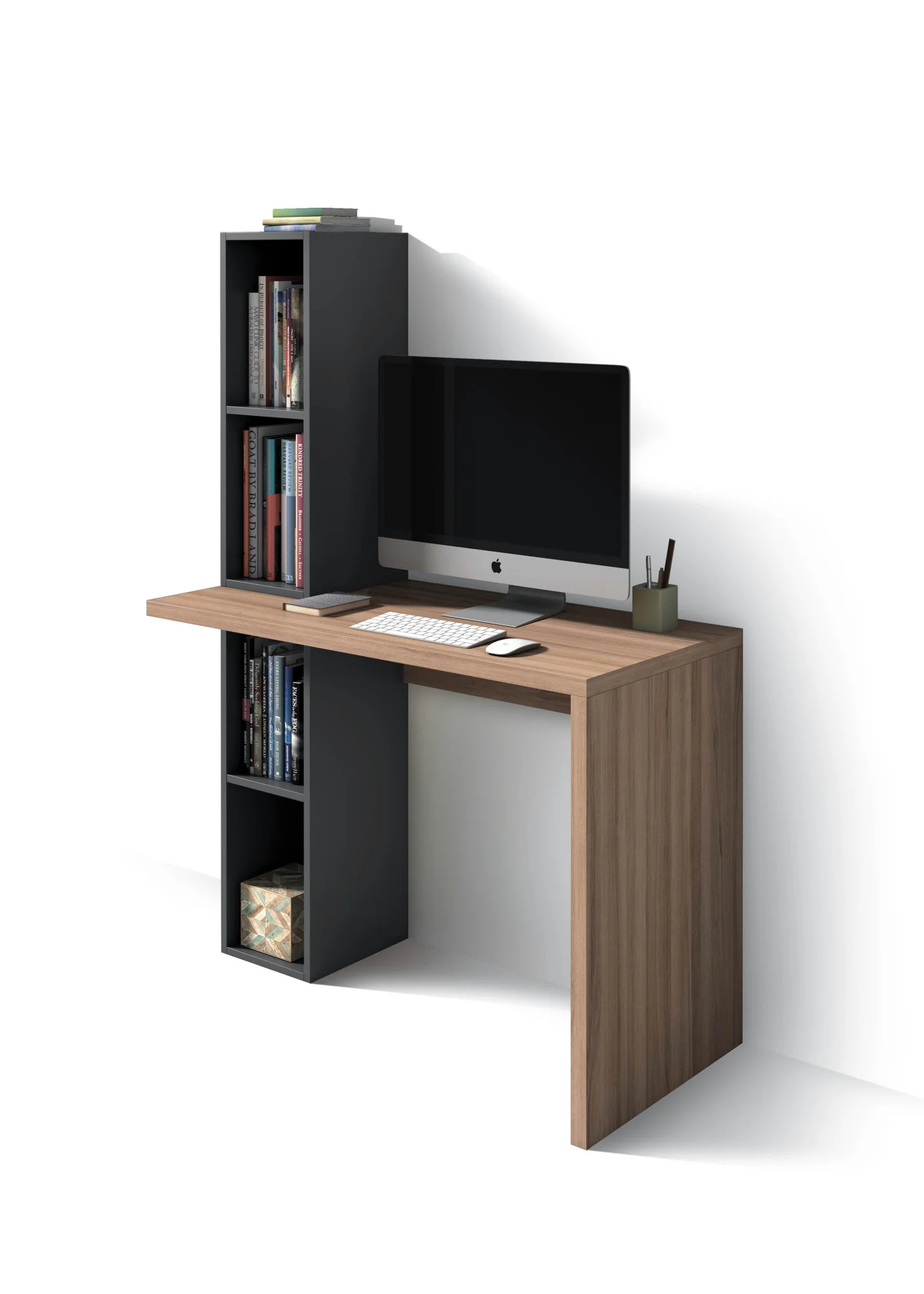 Mesa de estudio sobria fabricada en melamina. Además del amplio espacio de trabajo, esta pieza cuenta con dos módulos de almacenamiento, uno sobre la mesa y otro bajo la tapa. El planteamiento sencillo de este mueble lo convierten en un elemento muy versátil, pudiendose adaptar a diferentes estilos decorativos.
