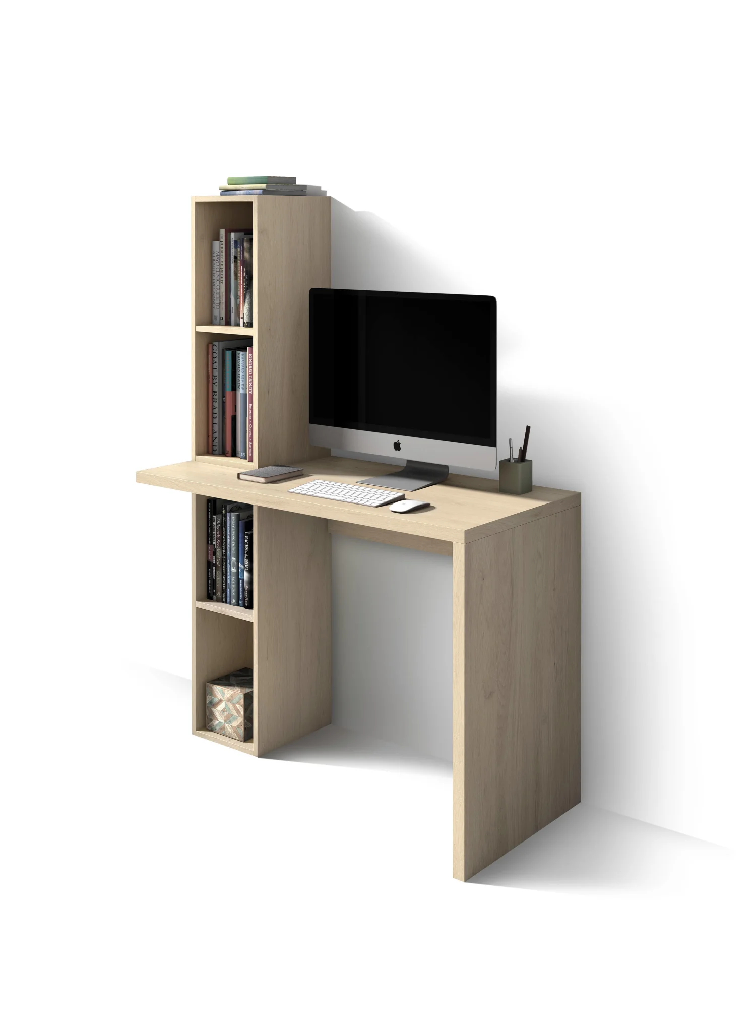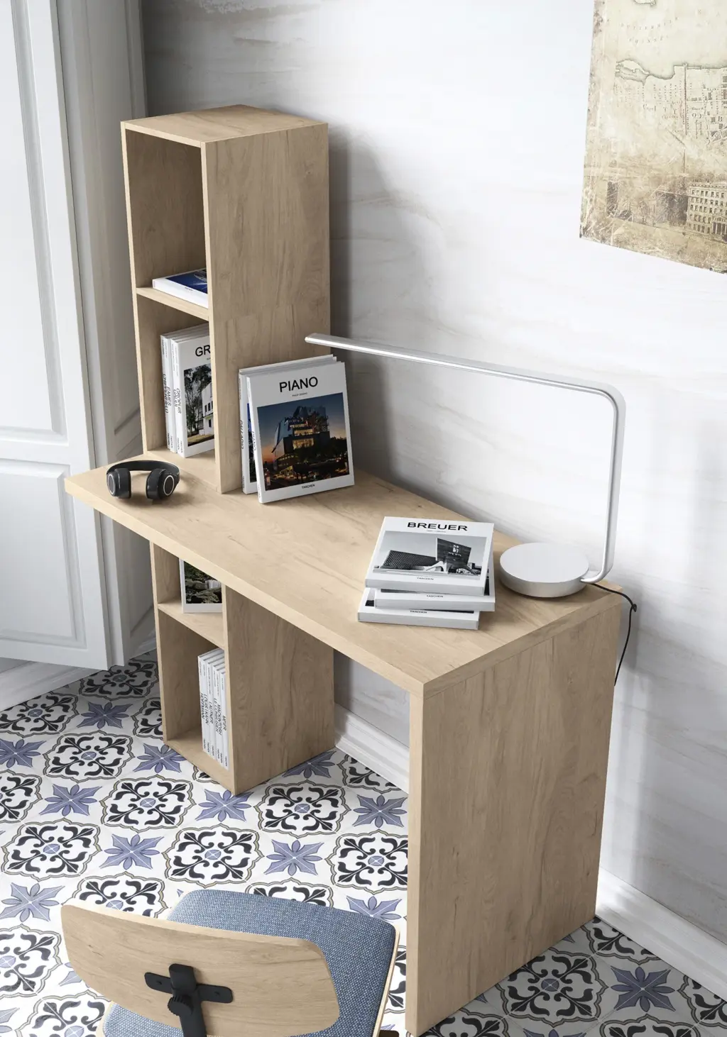 Mesa de estudio sobria fabricada en melamina. Además del amplio espacio de trabajo, esta pieza cuenta con dos módulos de almacenamiento, uno sobre la mesa y otro bajo la tapa. El planteamiento sencillo de este mueble lo convierten en un elemento muy versátil, pudiendose adaptar a diferentes estilos decorativos.