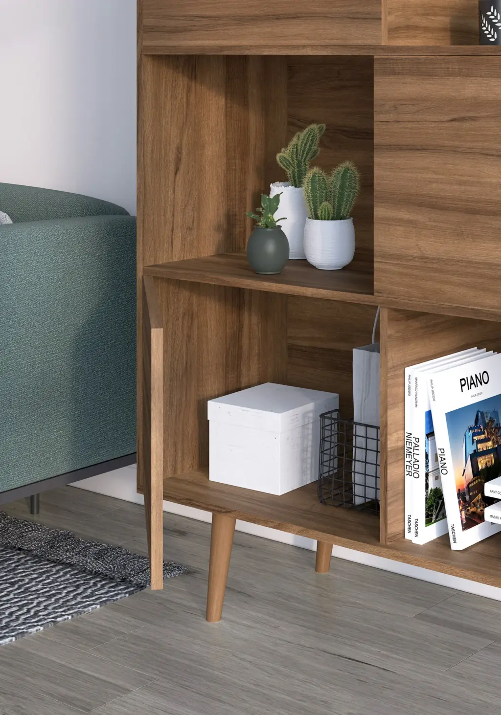 Aparador fabricado en melamina con patas de madera de haya. Este mueble se distribuye en 3 huecos abiertos y 3 compartimentos cerrados. Las múltiples combinaciones de acabados disponibles permiten adaptar esta pieza al estilo de cada uno, pudiendo escoger colores más neutros o más vivos.