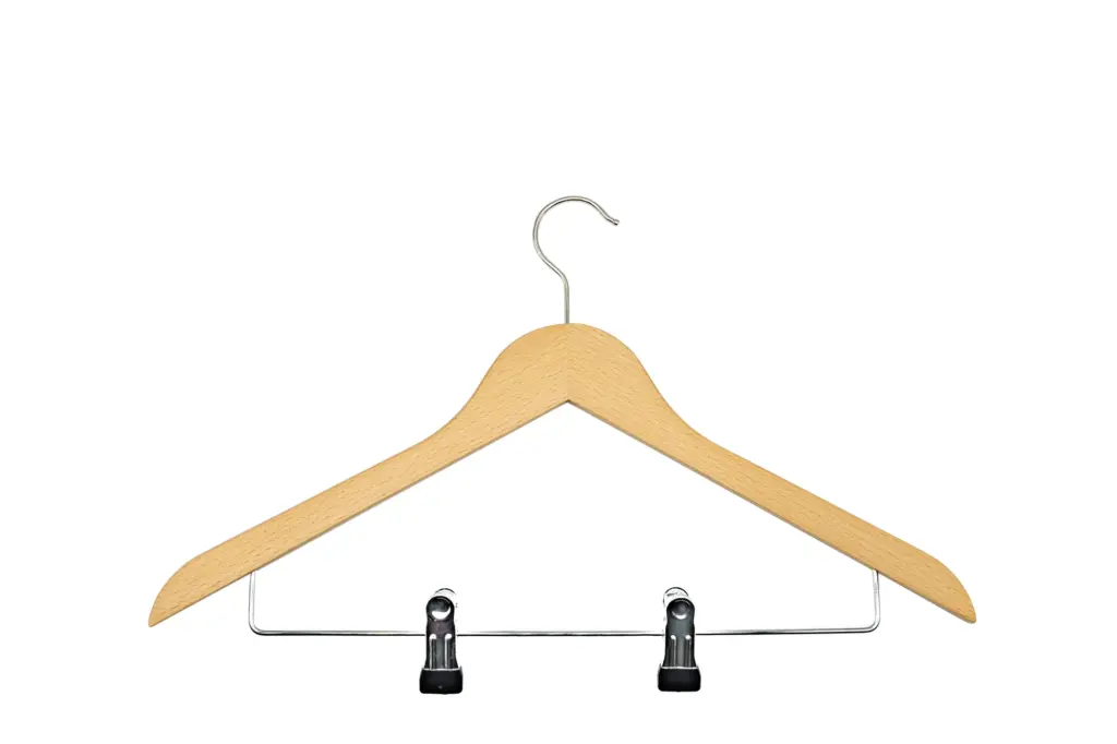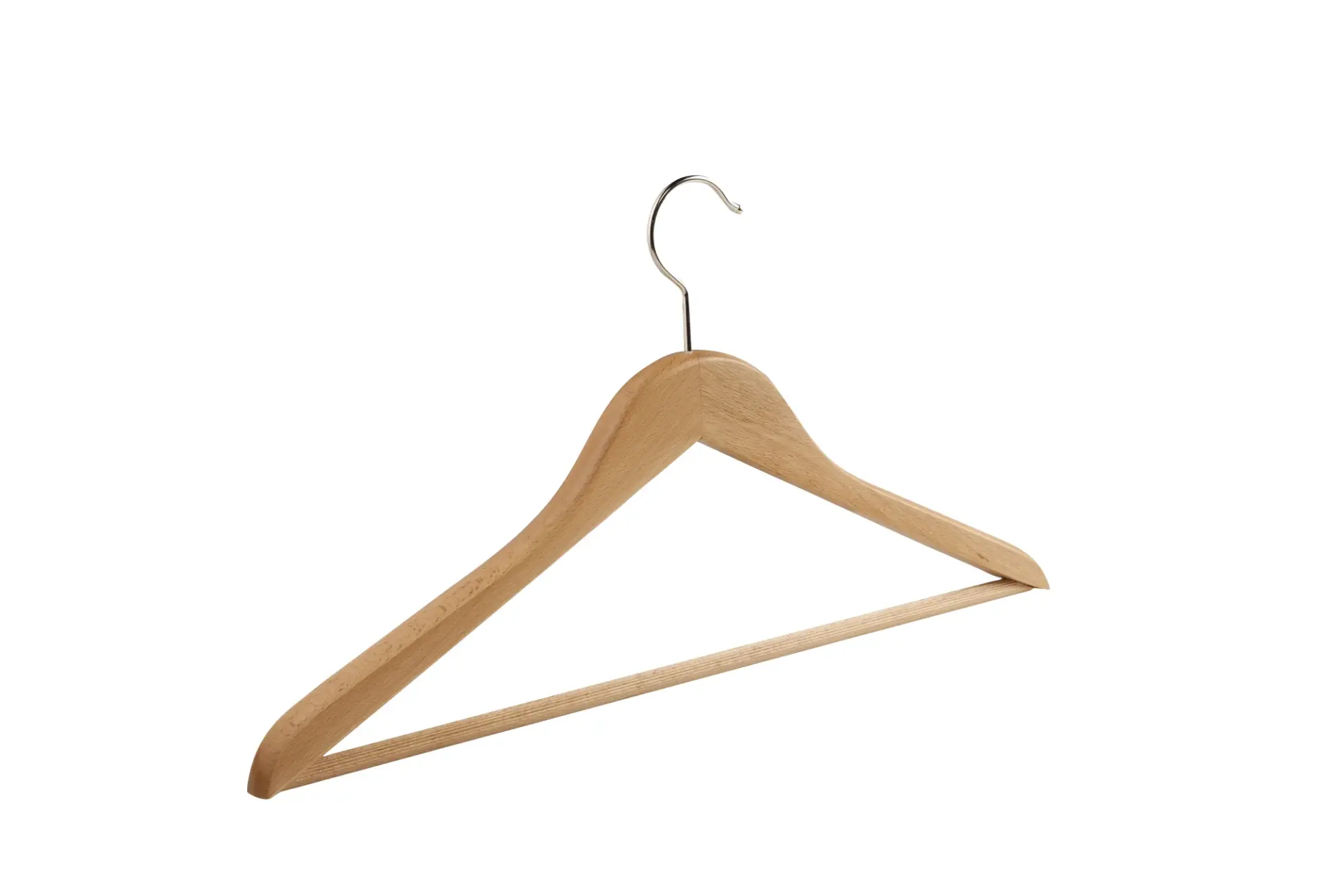Percha de armario de madera maciza con forma plana. Múltiples opciones tanto de color como de accesorios: puedes añadirle pinzas de resina o de metal, hacerle hendidura o ponerle anilla antirrobo. Además la podrás personalizar añadiendo tu logo serigrafiado. El packaging es de 40 unidades.