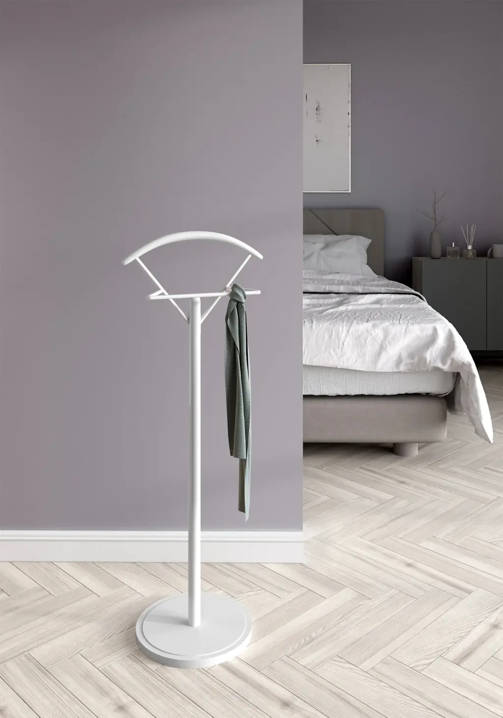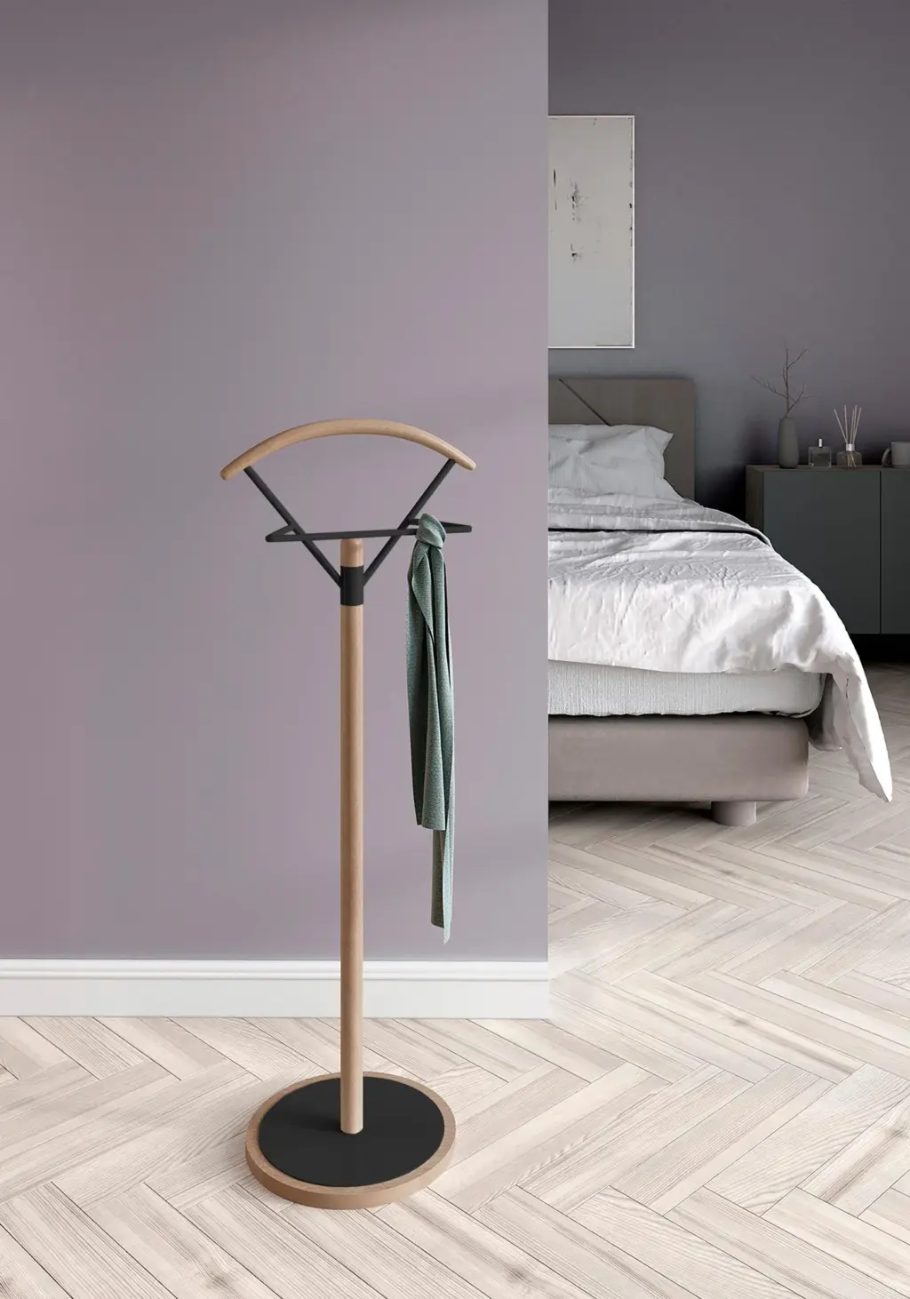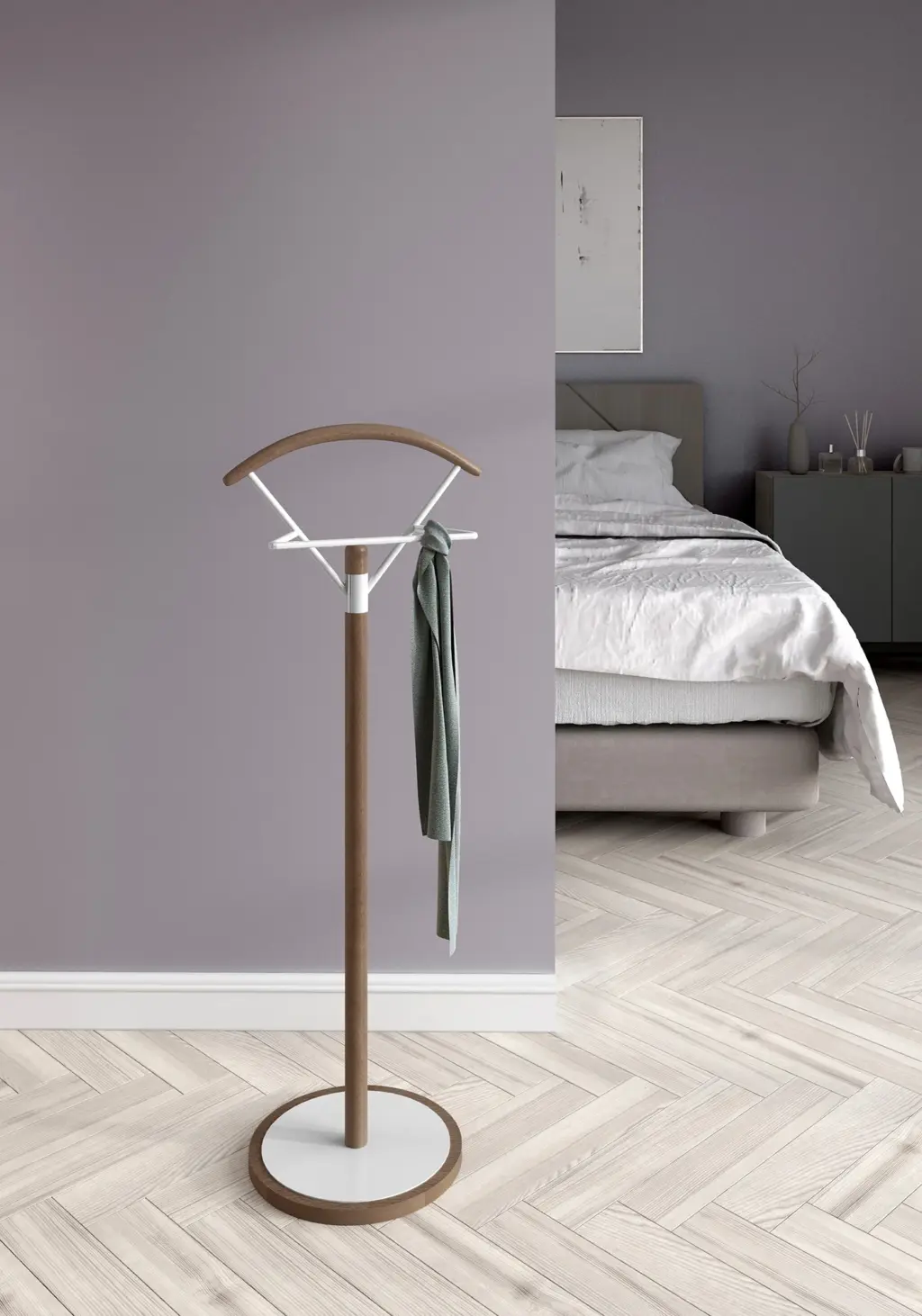 Galán de noche fabricado en madera de haya con base circular en MDF y pantalonera de metal lacado. Este galán con su diseño sencillo y estilizado aportará funcionalidad y un toque moderno que podrás adaptar al estilo del dormitorio gracias a la infinidad de colores disponibles.