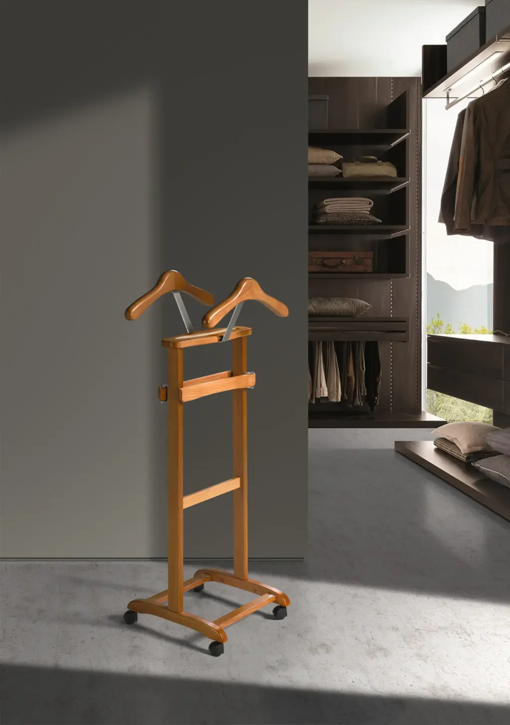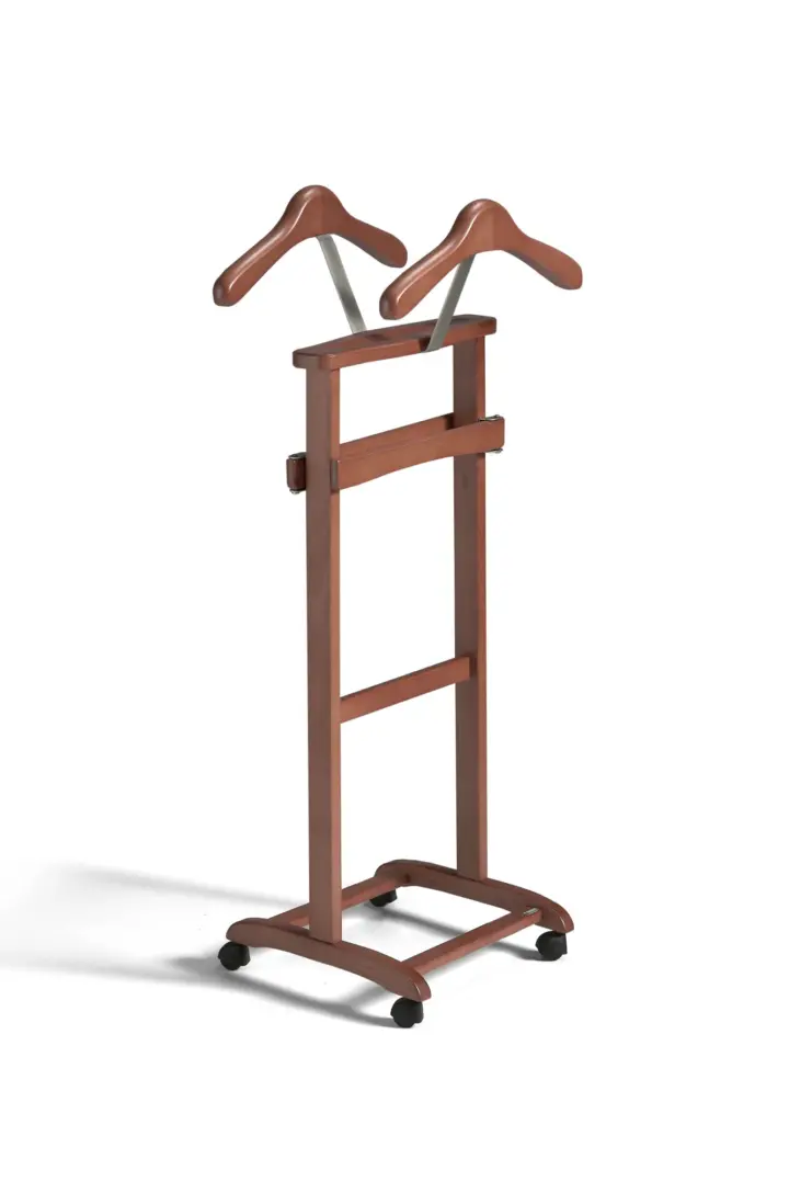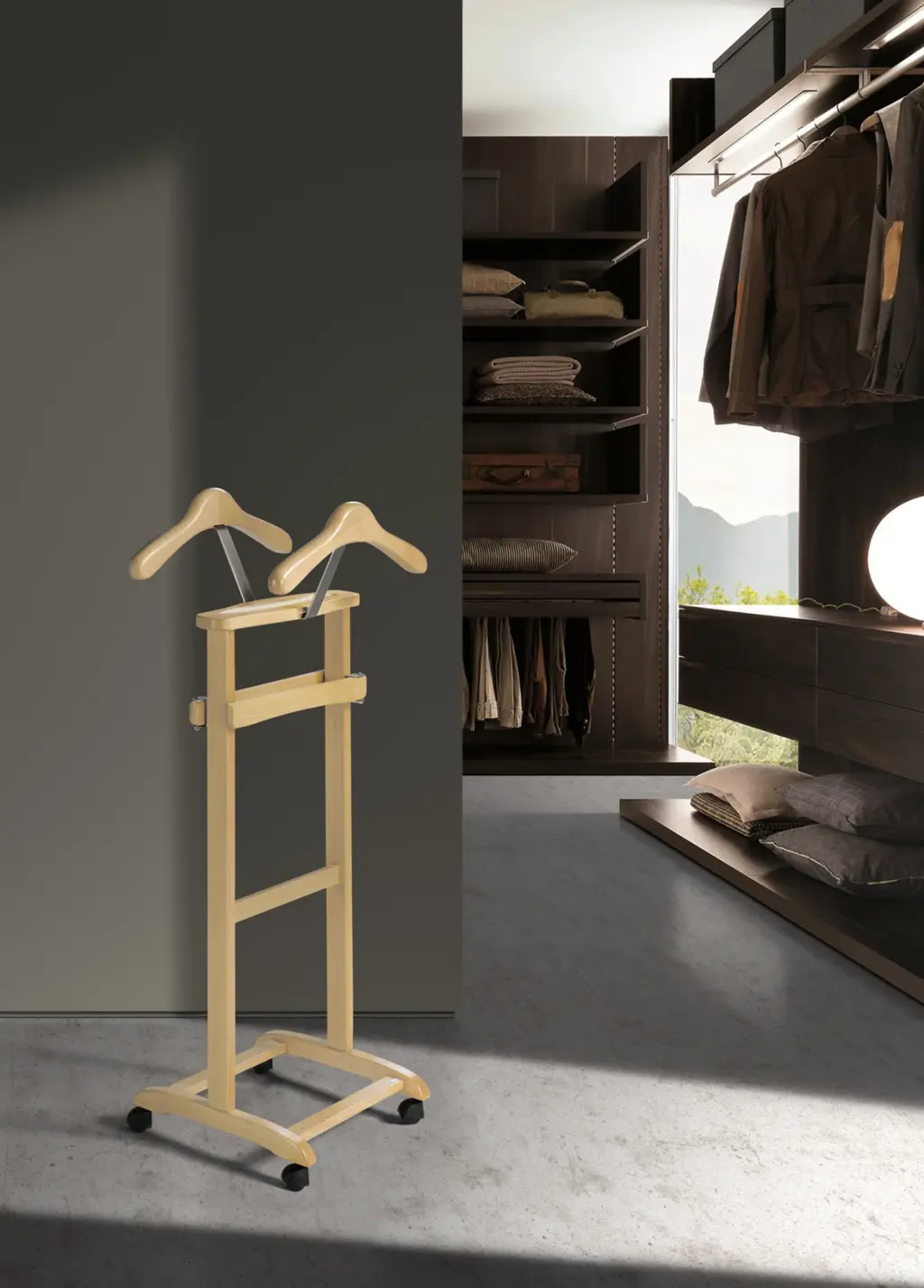 Galán de noche doble, fabricado en madera de haya con detalles en metal cromado. Este accesorio aporta gran funcionalidad gravias a su doble percha y sus dos pantaloneras abatibles. Además, también lleva incorporada una bandeja alargada perfecta para dejar pequeños objetos. Las ruedas permiten su fácil desplazamiento. Elige entre una amplia variedad de colores para adaptarlo a tus gustos.