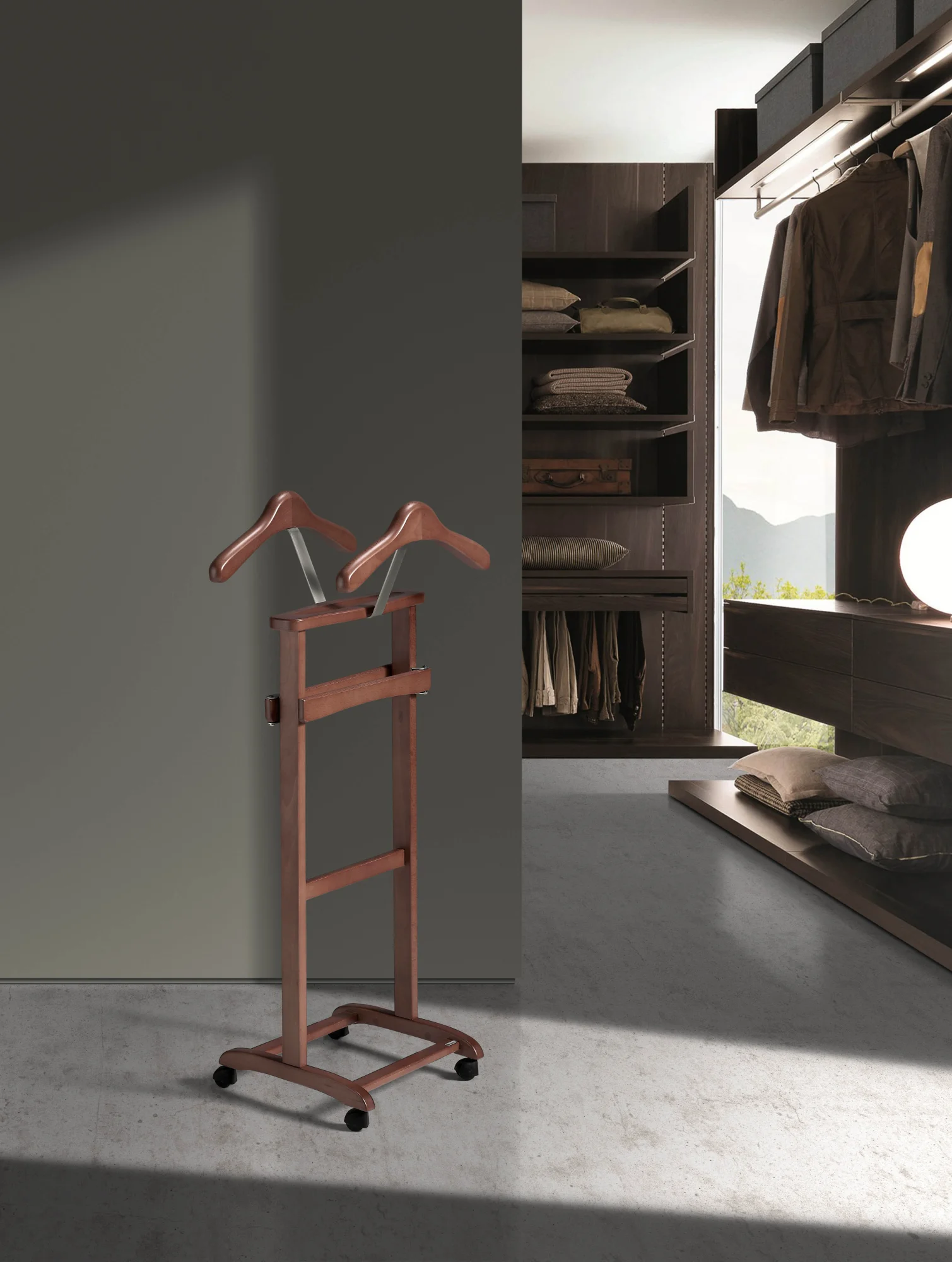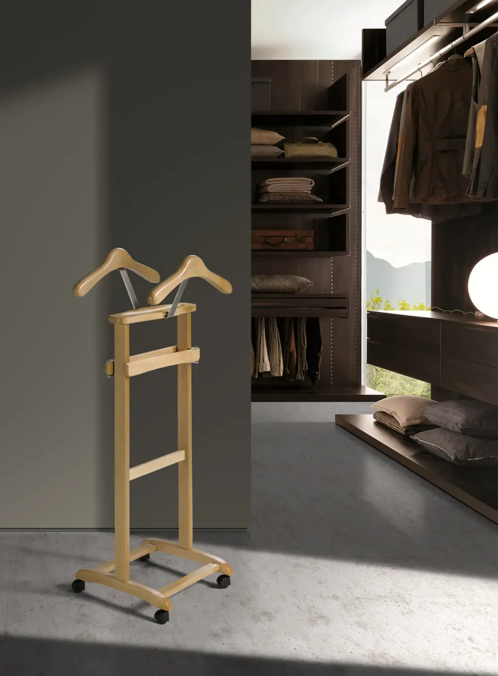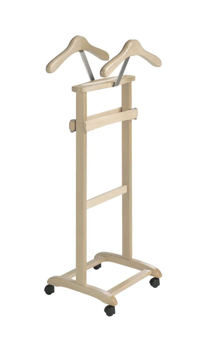 Galán de noche doble, fabricado en madera de haya con detalles en metal cromado. Este accesorio aporta gran funcionalidad gravias a su doble percha y sus dos pantaloneras abatibles. Además, también lleva incorporada una bandeja alargada perfecta para dejar pequeños objetos. Las ruedas permiten su fácil desplazamiento. Elige entre una amplia variedad de colores para adaptarlo a tus gustos.