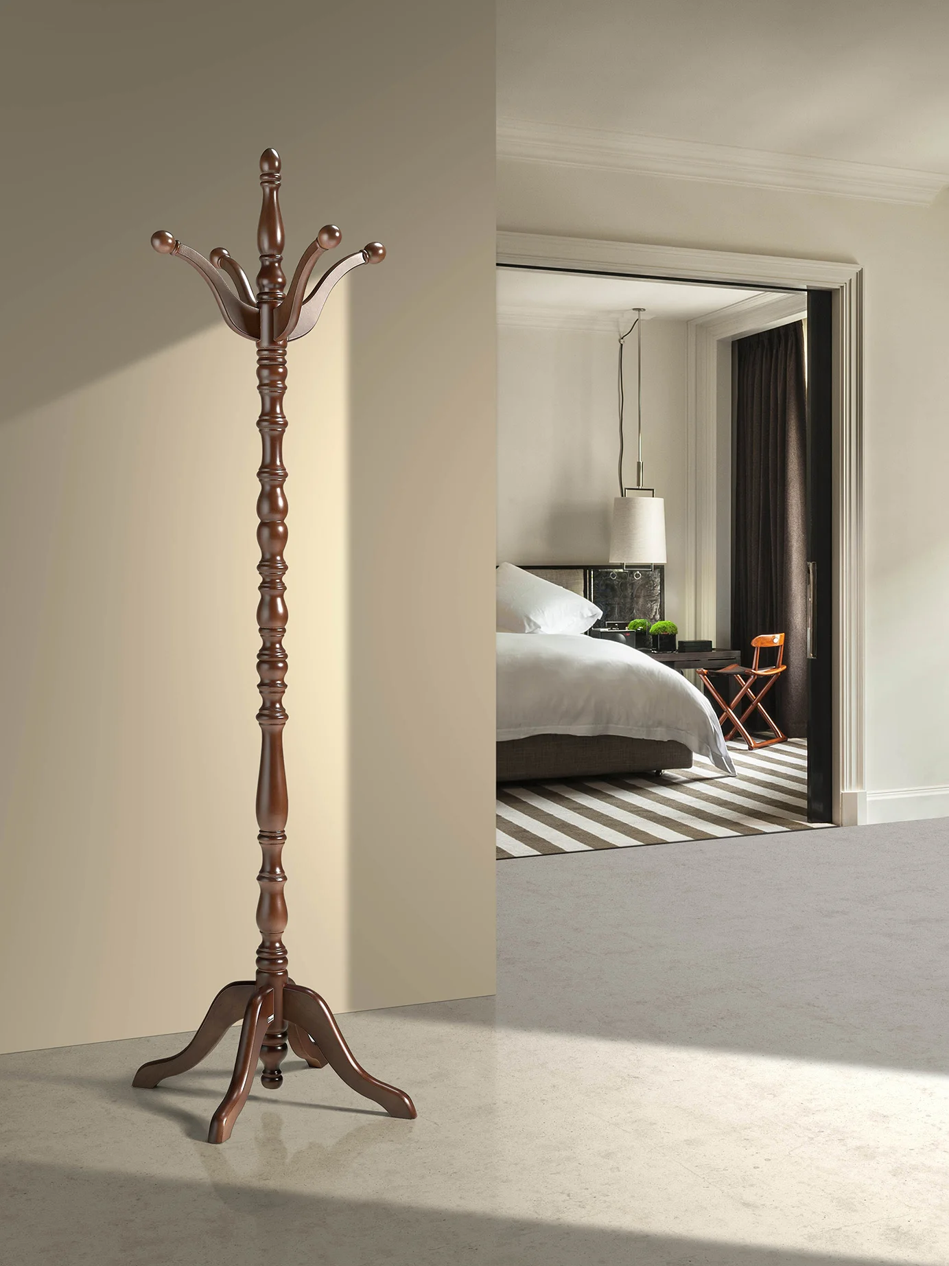 Perchero de pie de estilo clásico fabricado en madera de haya. Con su trabajado mástil y su gran firmeza, este elemento se convertirá en el mejor accesorio de tu hogar, dando un toque elegante y sobrio. Elige el acabado que mejor se adapte a tus necesidades.