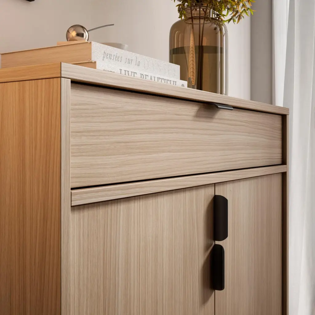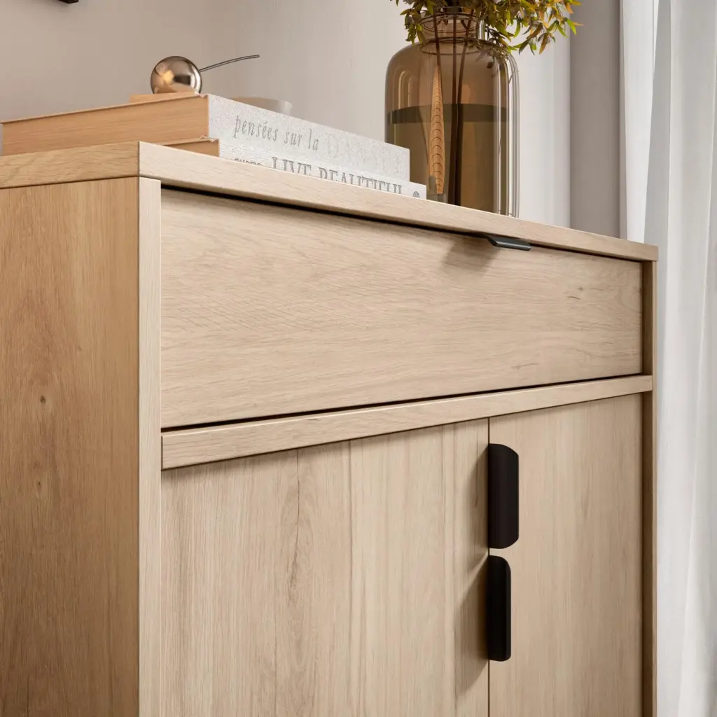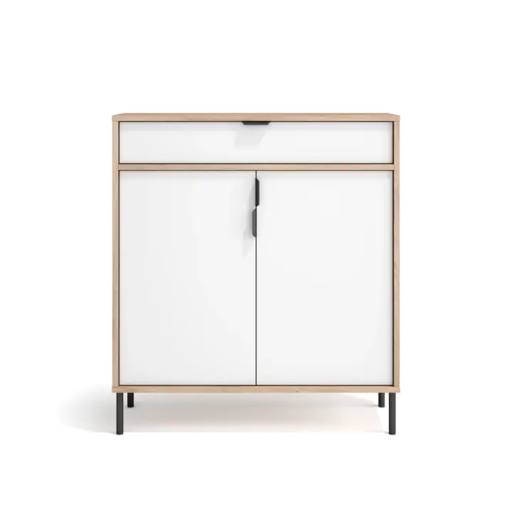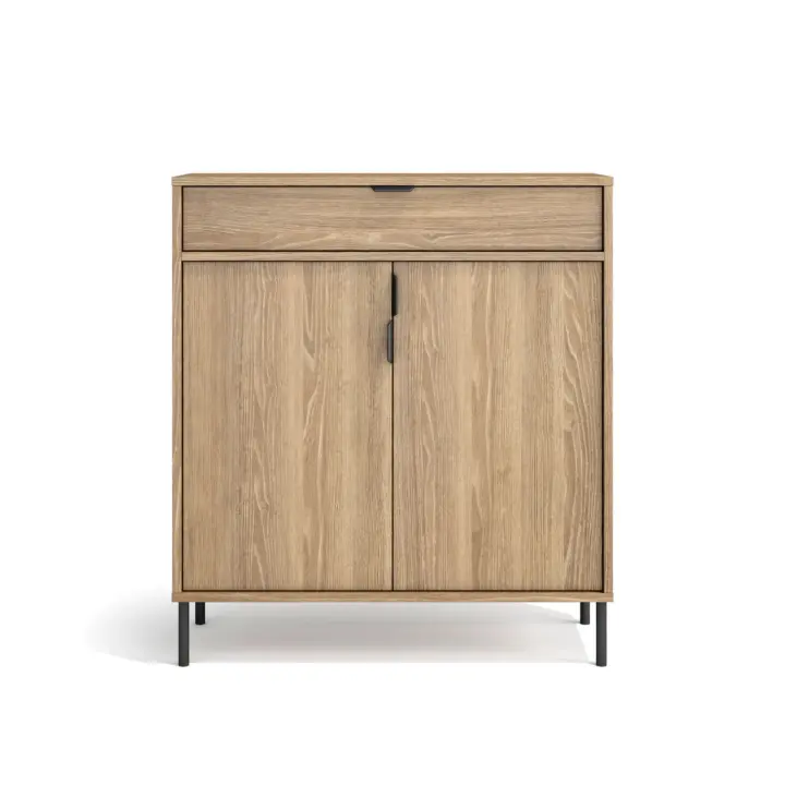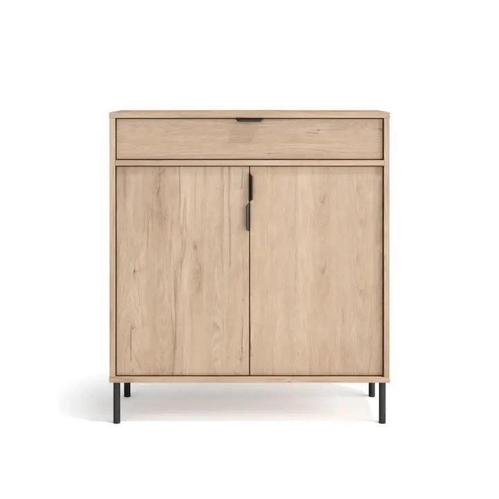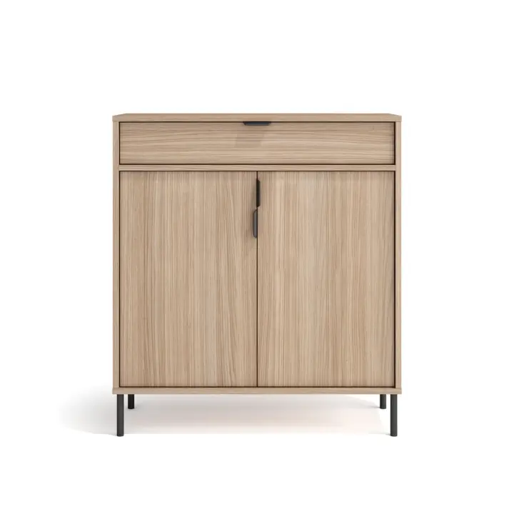Zapatero en melamina con patas y tiradores metálicos en color negro. Dispone de un cajón en la parte superior y de 2 estantes interiores que pueden colocarse de manera horizontal o inclinada. Disponible en 4 acabados, podrás elegir el que mejor se adapte a tu hogar.