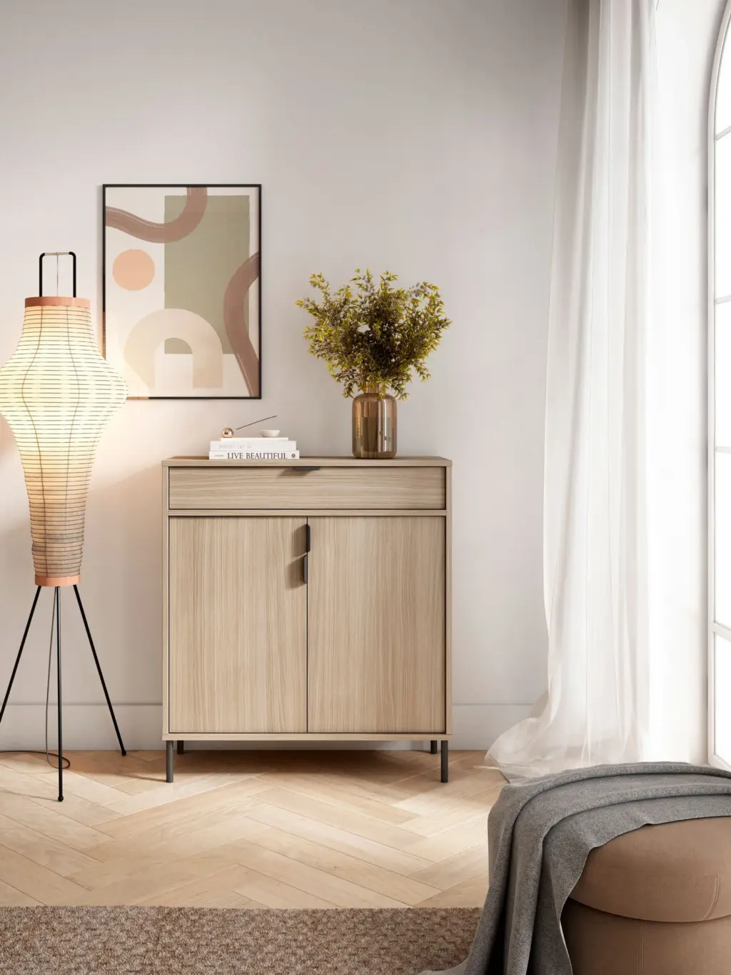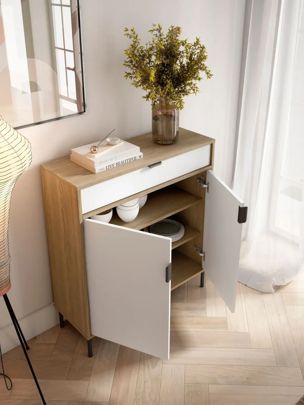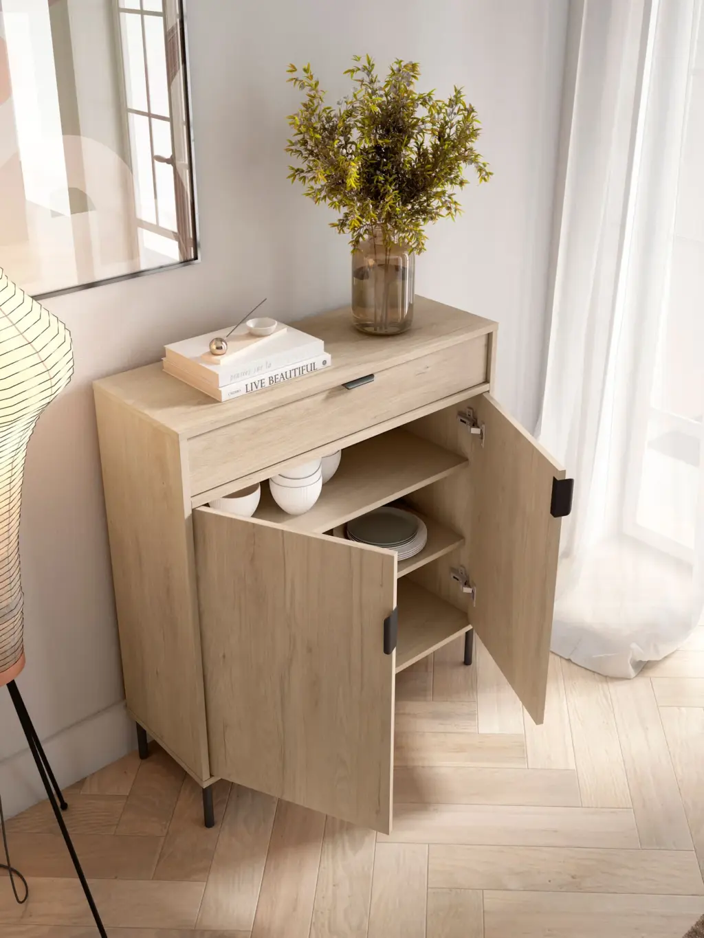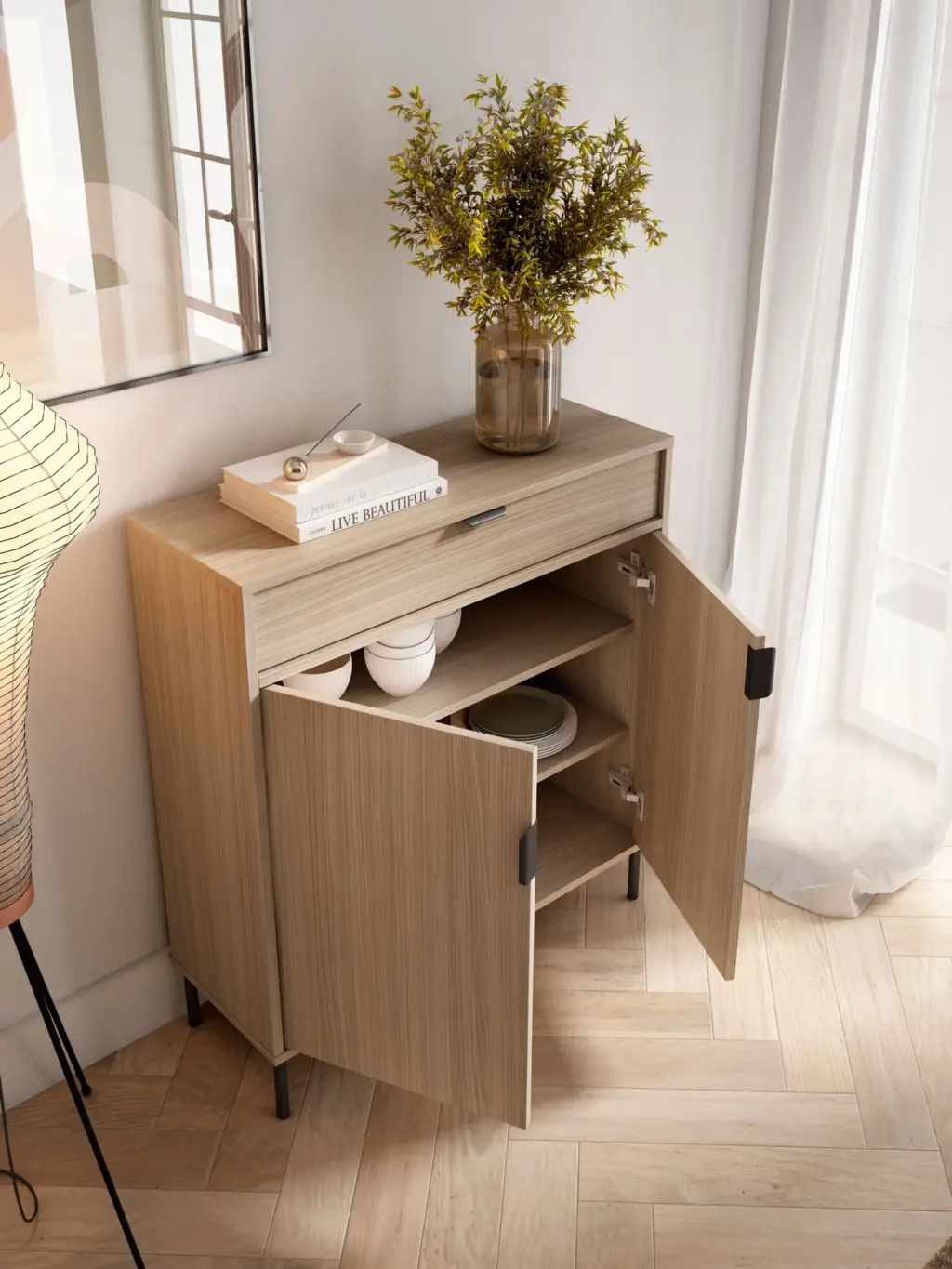 Zapatero en melamina con patas y tiradores metálicos en color negro. Dispone de un cajón en la parte superior y de 2 estantes interiores que pueden colocarse de manera horizontal o inclinada. Disponible en 4 acabados, podrás elegir el que mejor se adapte a tu hogar.