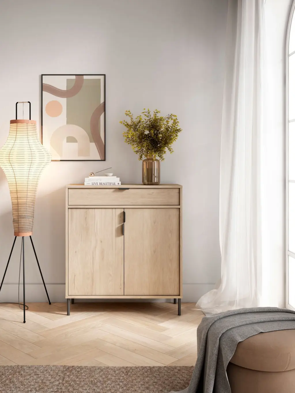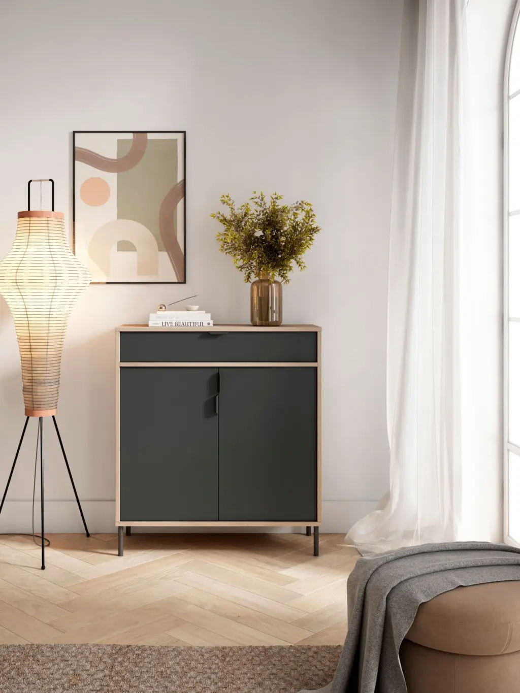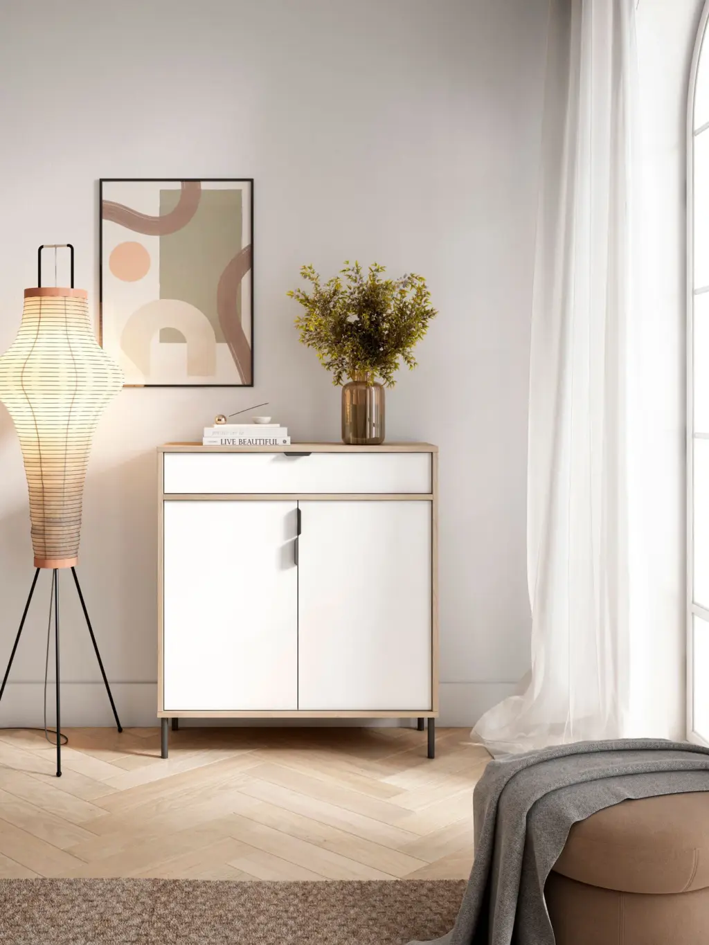 Zapatero en melamina con patas y tiradores metálicos en color negro. Dispone de un cajón en la parte superior y de 2 estantes interiores que pueden colocarse de manera horizontal o inclinada. Disponible en 4 acabados, podrás elegir el que mejor se adapte a tu hogar.