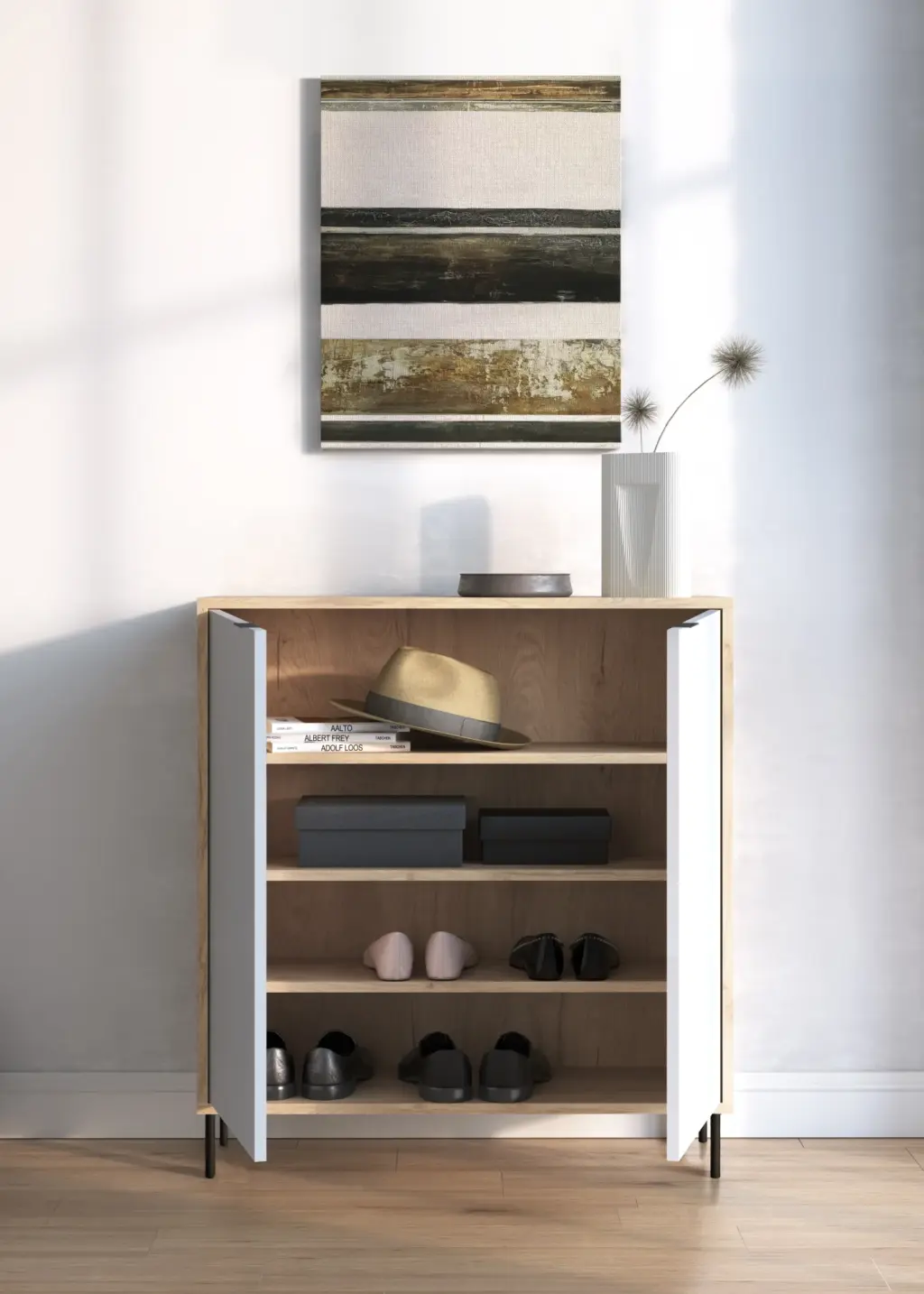 Zapatero fabricado en melamina con patas y tiradores metálicos en color negro. Diseño sencillo lleno de practicidad, cuyos estantes podrás colocar de forma horizontal o inclinada, dependiendo de la necesidad. Su diseño neutro permite utilizarlo como mueble de entrada, mueble auxiliar en el dormitorio e infinitas posibilidades más.