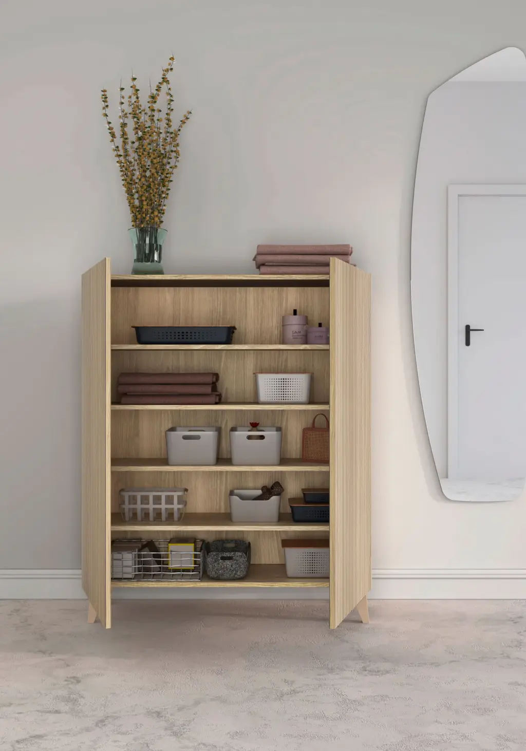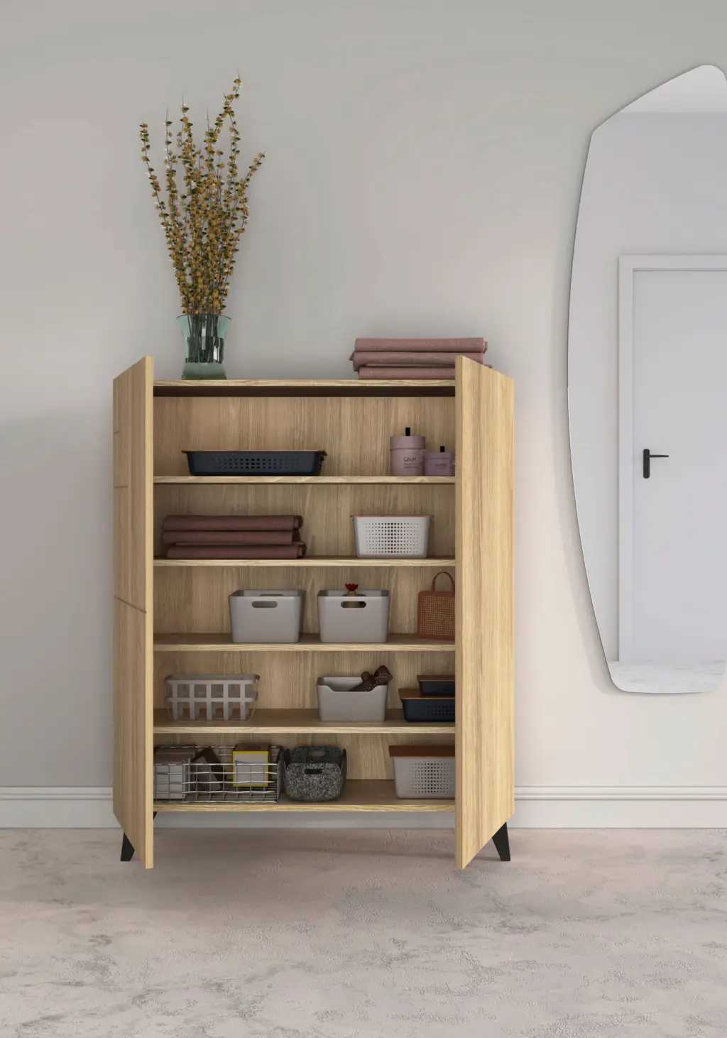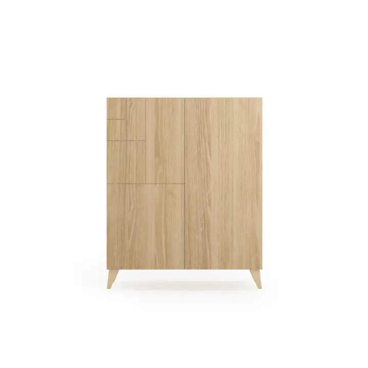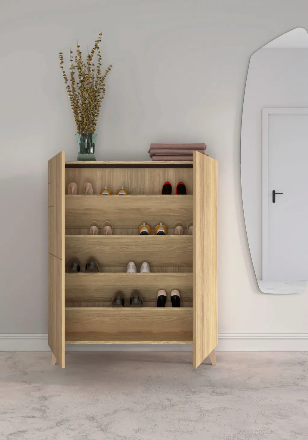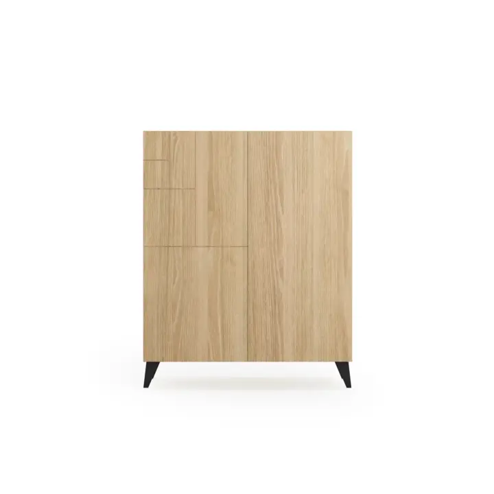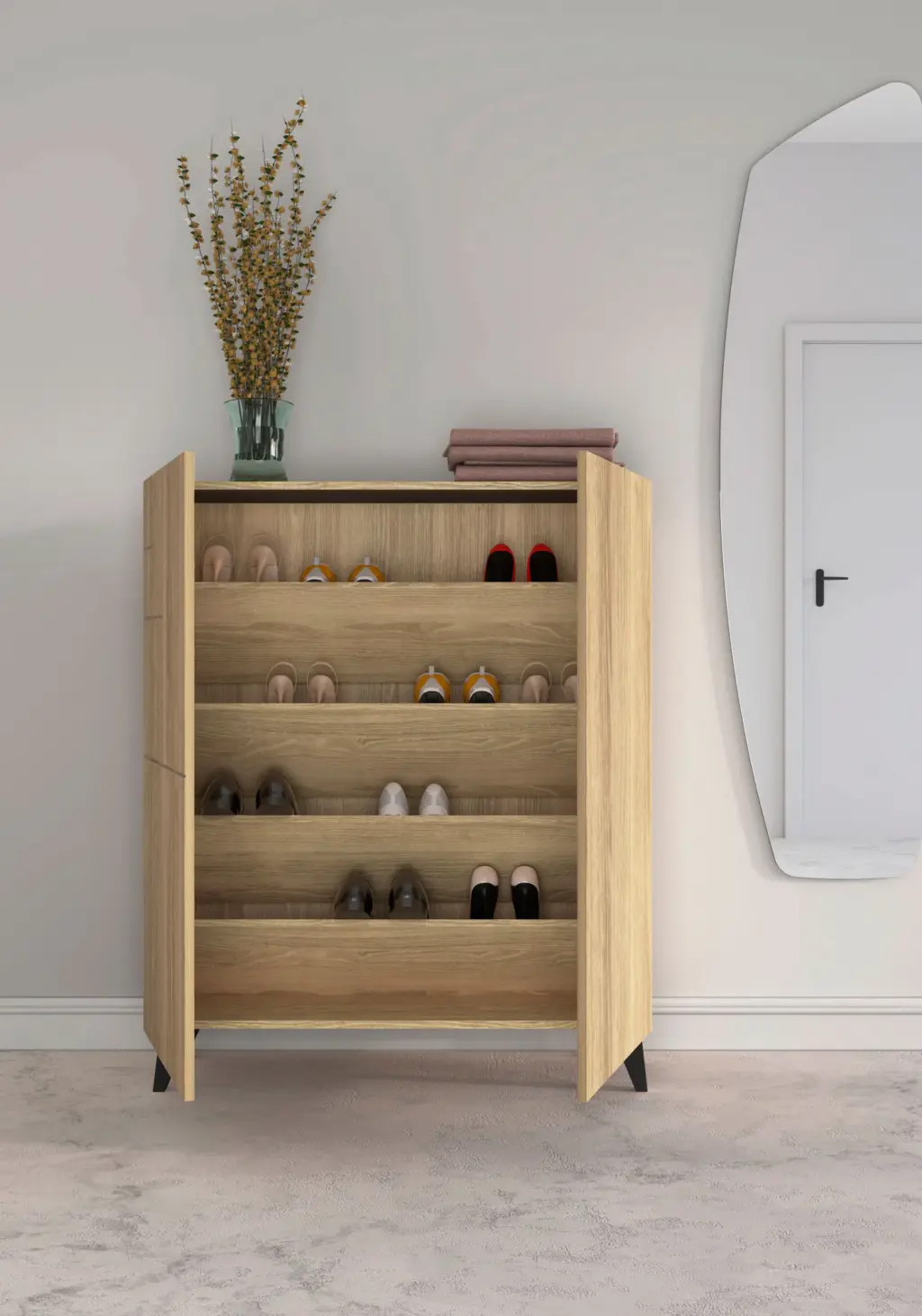 Zapatero fabricado en melamina con patas de madera de haya. El interior se compone de 4 estantes que se pueden posicionar de forma horizontal o inclinada, dependiendo de cada necesidad de almacenamiento. Gracias a su gran variedad de acabados y su multifuncionalidad, se adaptará en infinidad de espacios y permitirá crear un espacio acogedor en cualquier estancia de la casa.