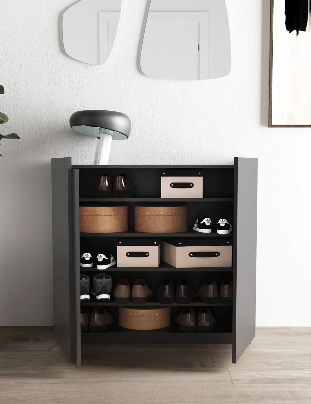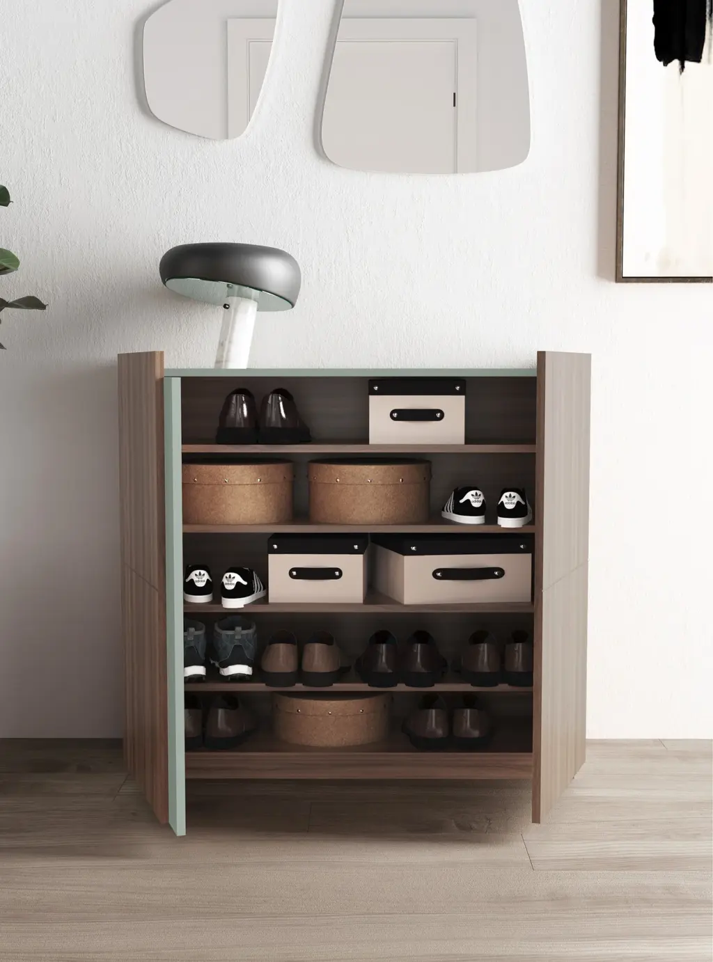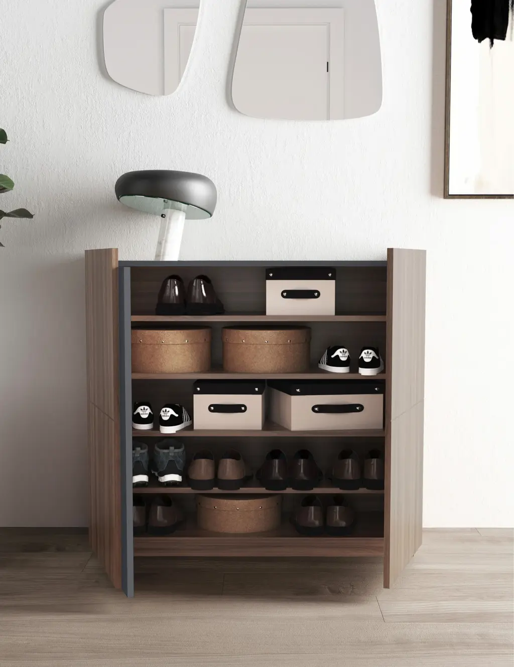 Zapatero fabricado en melamina. El interior se compone de 4 amplios estantes. Gracias a su gran variedad de acabados y su multifuncionalidad, se adaptará en infinidad de espacios proporcionando gran capacidad de almacenamiento en el dormitorio, la entrada o en cualquier otra estancia del hogar.