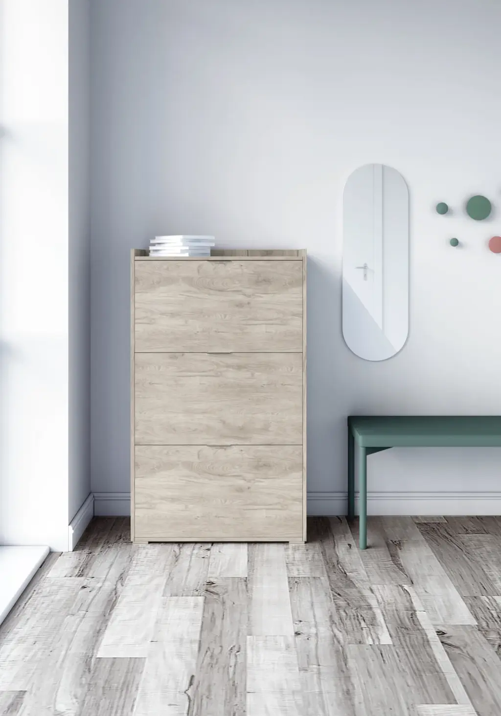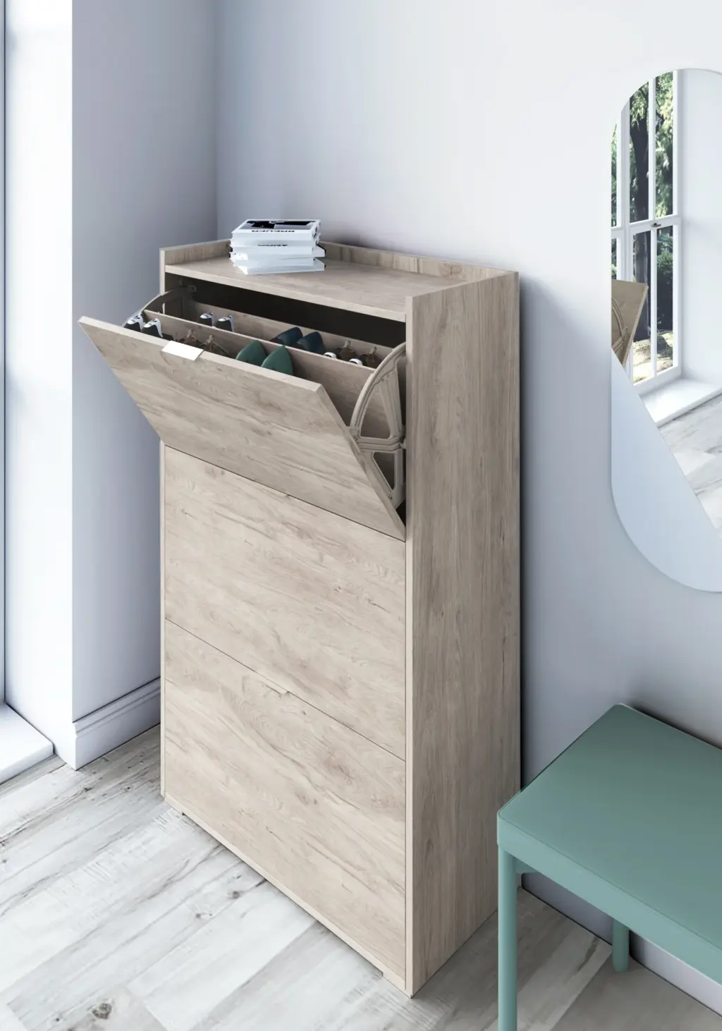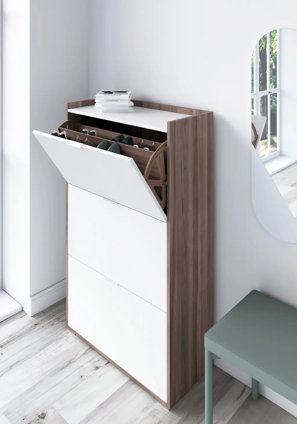 Zapatero abatible fabricado en melamina. Cada puerta esconde 2 amplios compartimentos proporcionando gran capacidad de almacenamiento, llegando a poder almacenar hasta 18 pares de calzado. La sencillez de su dieño lo hacen un mueble adaptable a diversos estilos y entornos.