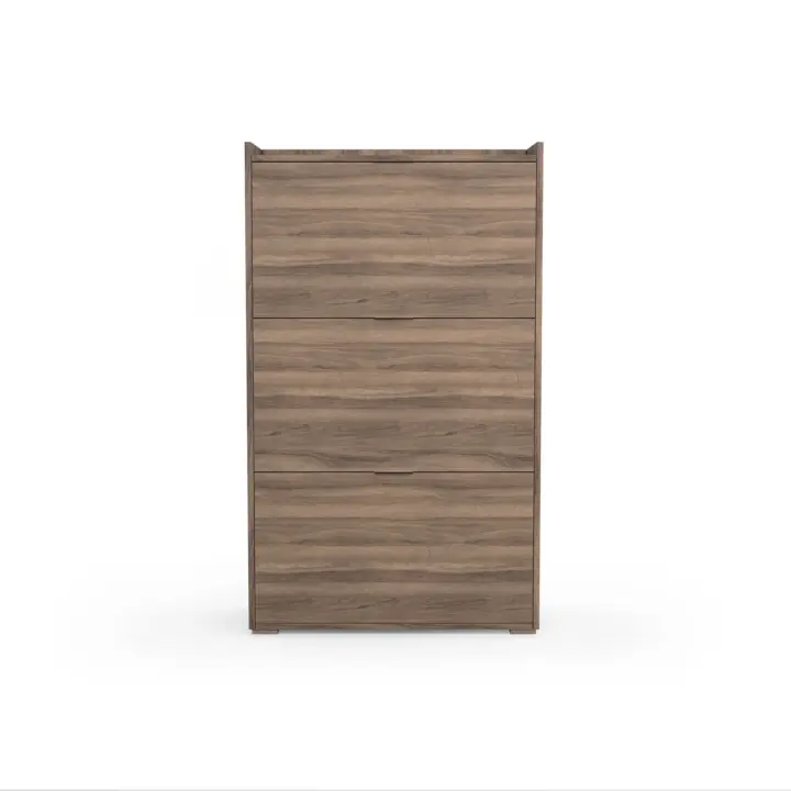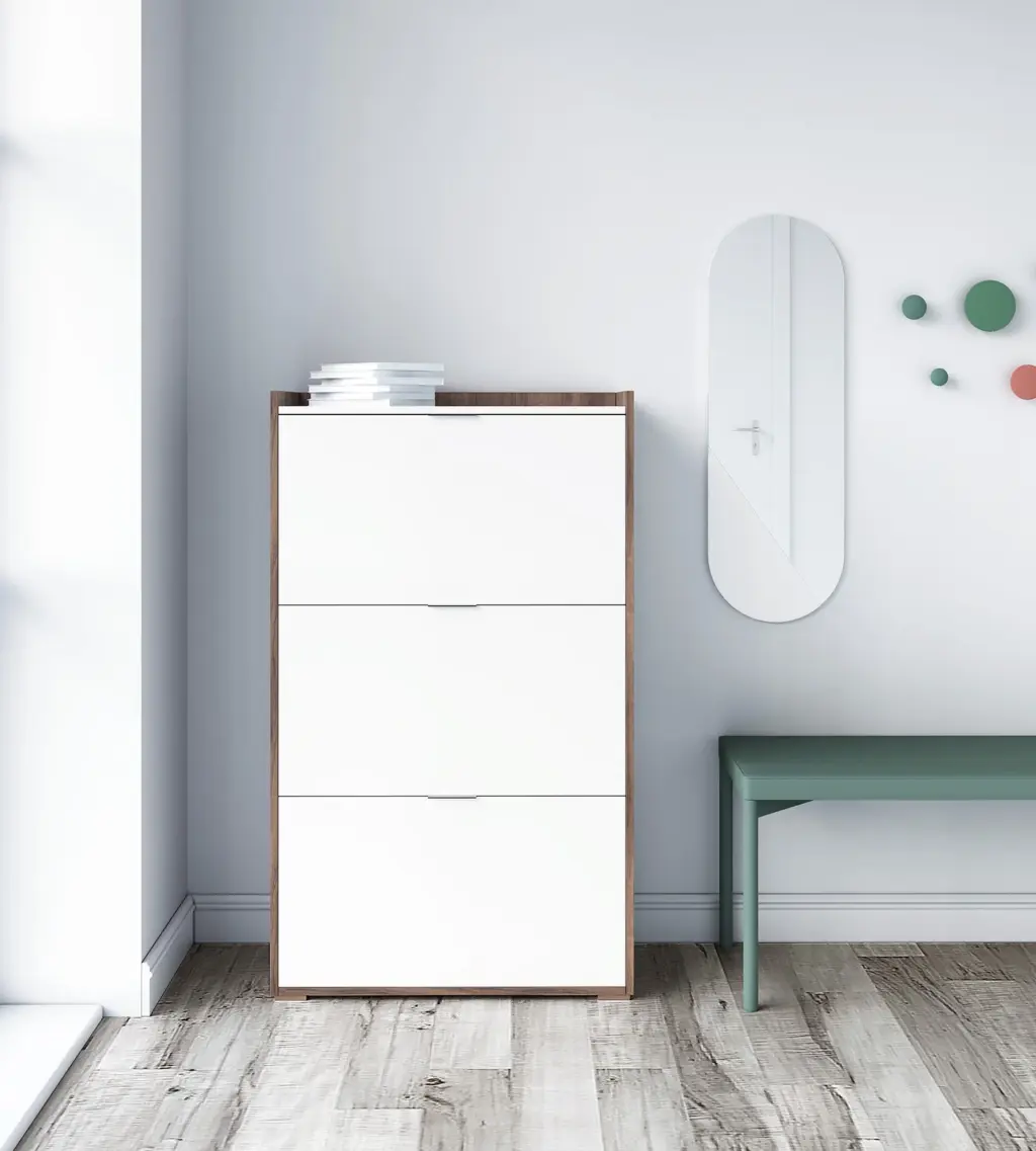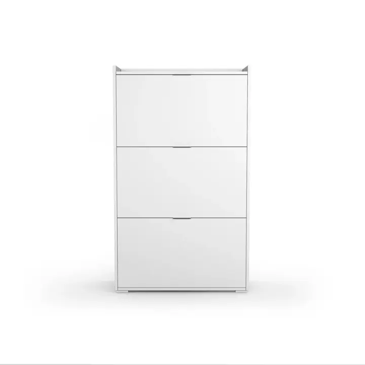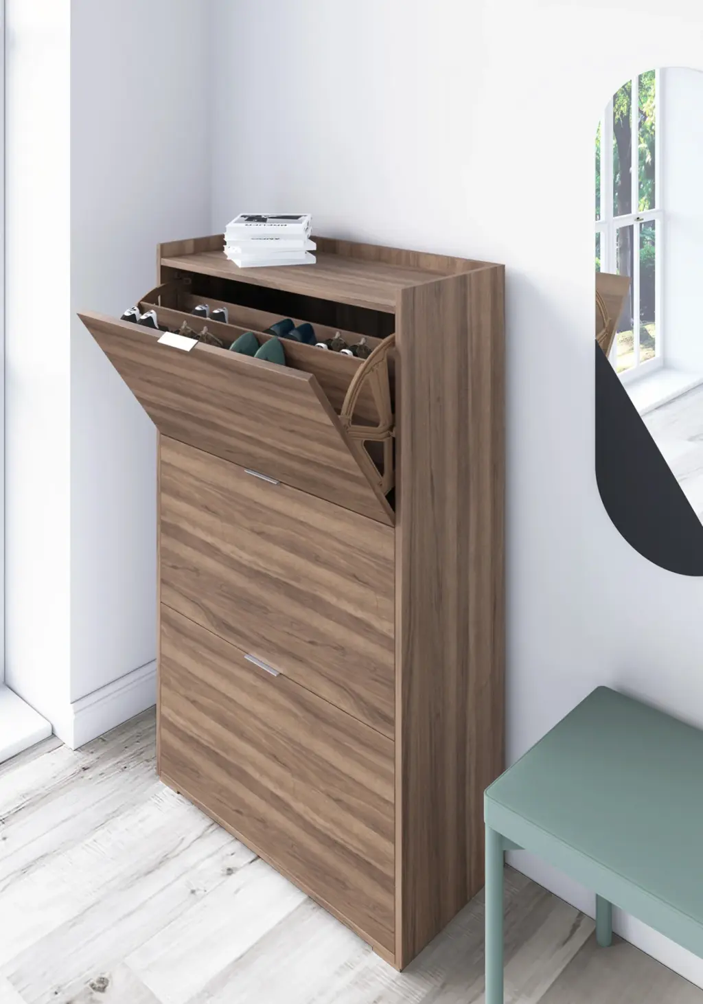 Zapatero abatible fabricado en melamina. Cada puerta esconde 2 amplios compartimentos proporcionando gran capacidad de almacenamiento, llegando a poder almacenar hasta 18 pares de calzado. La sencillez de su dieño lo hacen un mueble adaptable a diversos estilos y entornos.