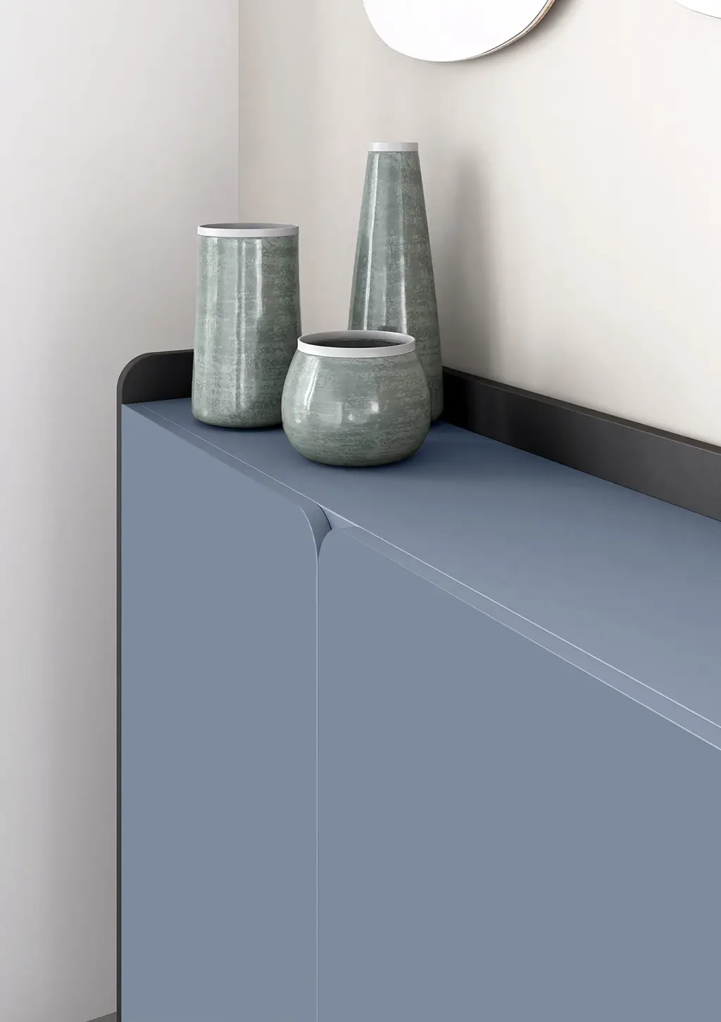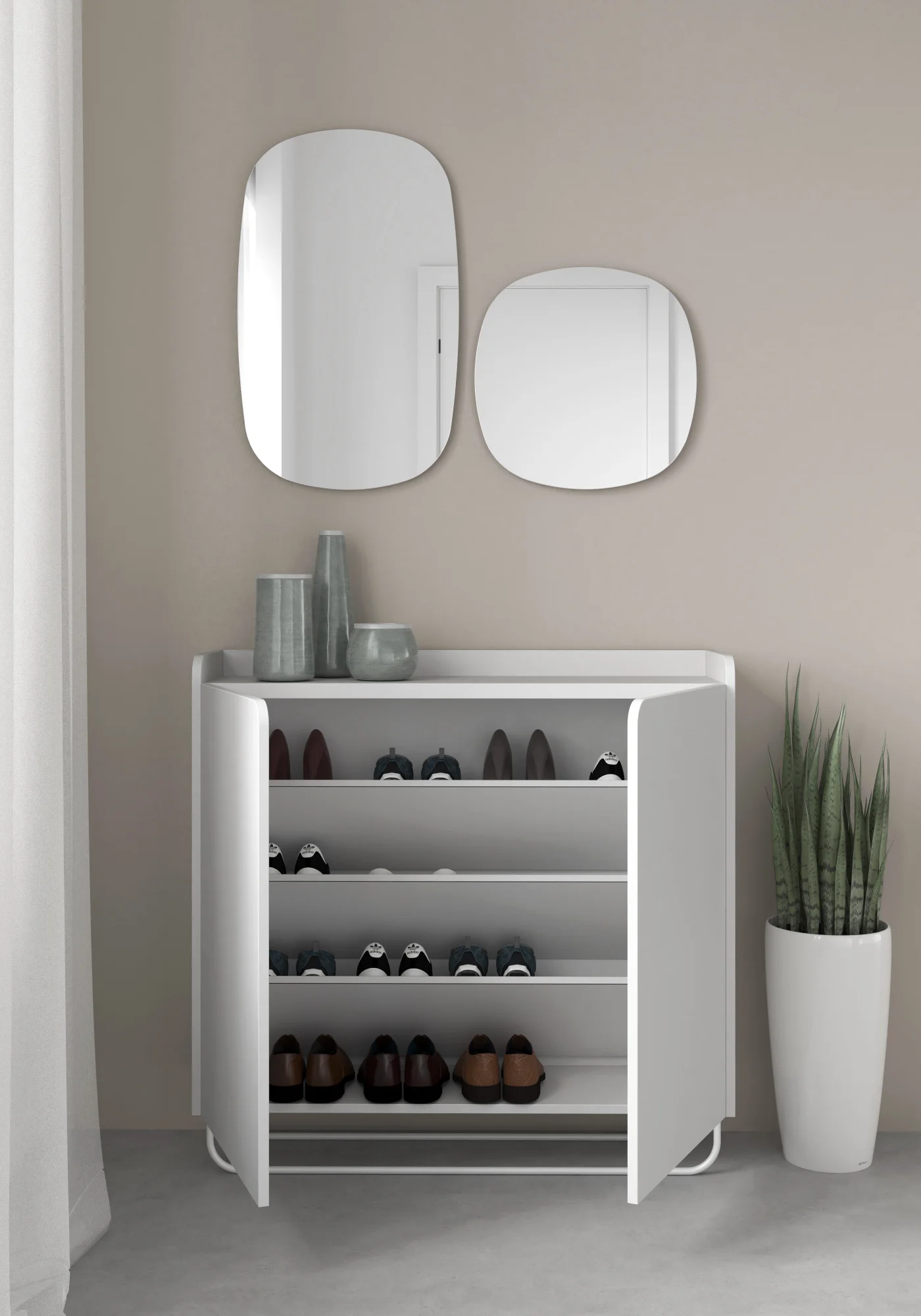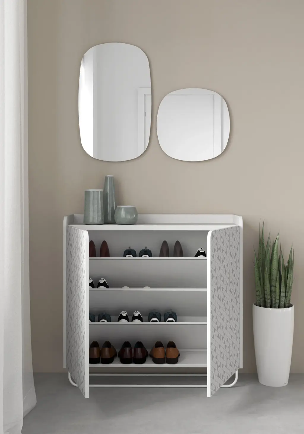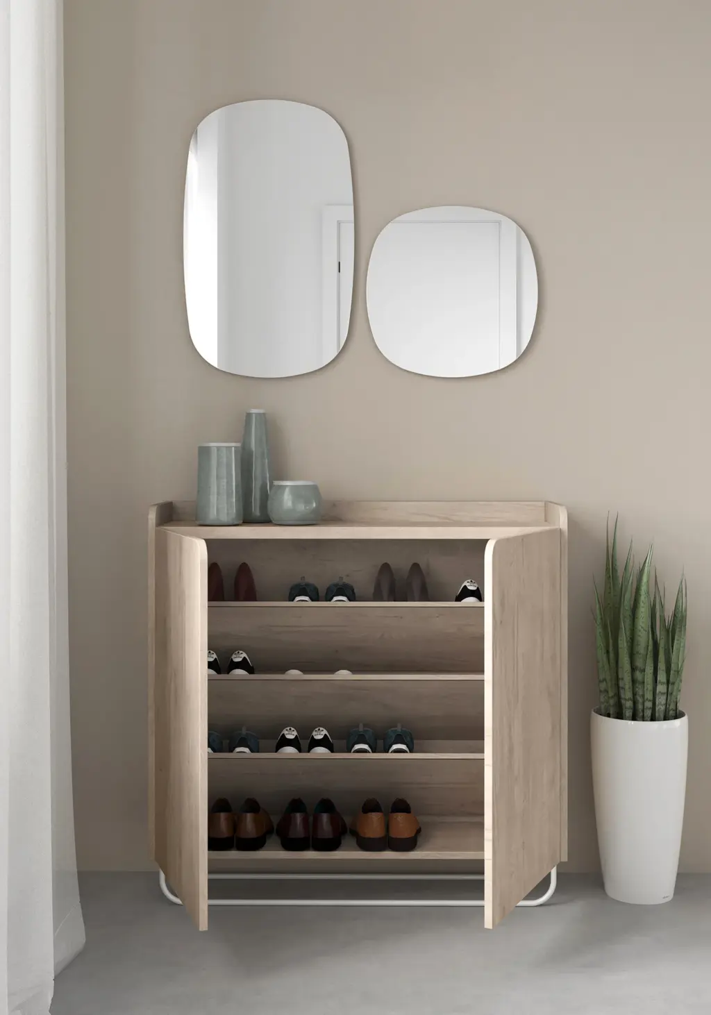 Zapatero fabricado en melamina con patas metálicas lacadas. El interior se compone de 5 estantes que se pueden posicionar de forma horizontal o inclinada, dependiendo de cada necesidad de almacenamiento. Las líneas curvas dan personalidad a este mueble auxiliar, que, gracias a su gran variedad de acabados y su multifuncionalidad, se adaptará en infinidad de espacios.