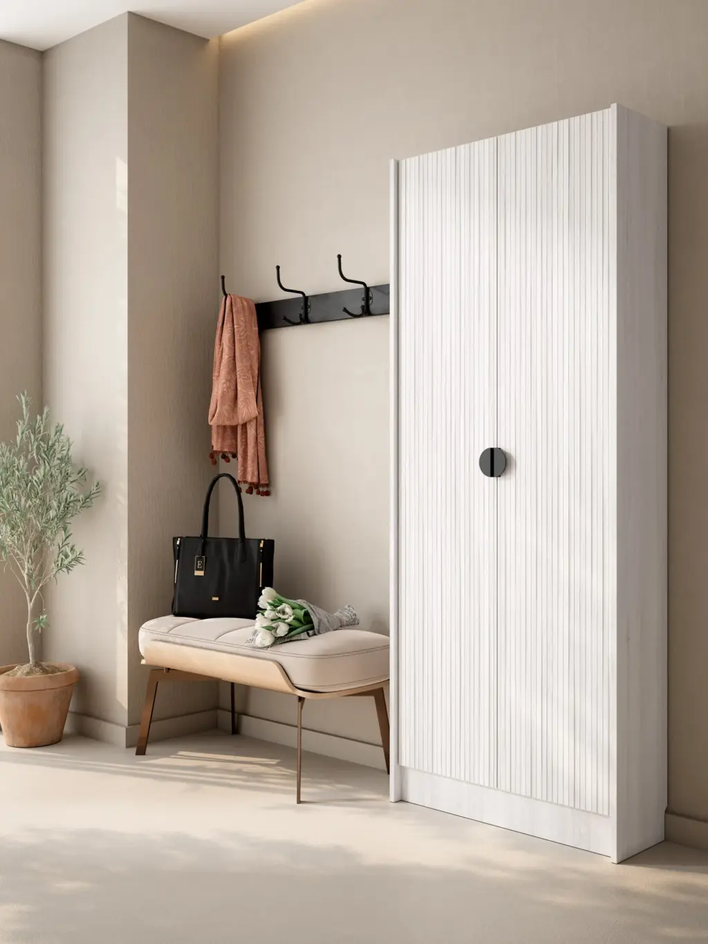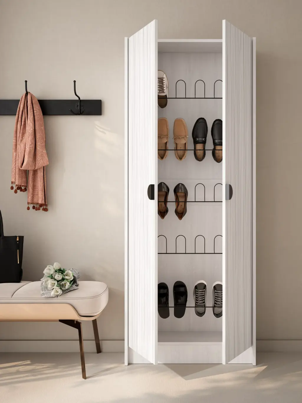 Mueble zapatero alto, equipado con 5 colgadores metálicos, los cuales permiten colgar 3 pares de calzado cada uno, dando lugar a una gran capacidad de almacenamiento: 15 pares. Descubre todos los acabados disponibles, para llevarte el que mejor se adapte a tu estilo.